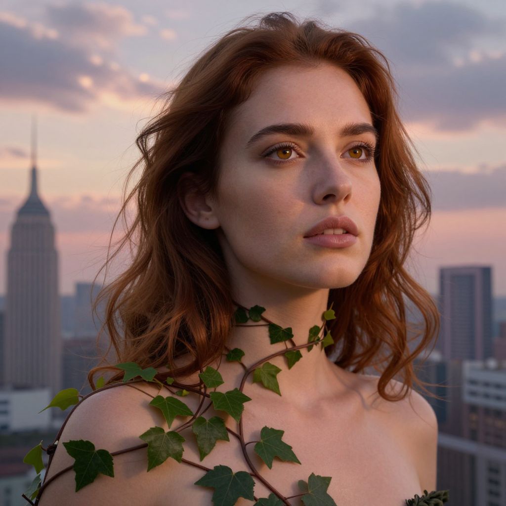 Photorealistic digital portrait of a young woman with fair skin and wavy, auburn hair, set against a cityscape at sunset. She has striking green eyes, full lips, and a slightly pensive expression. A vine with green leaves wraps around her bare shoulders. The background features a soft, pastel-colored sky with clouds, and blurred skyscrapers, including a recognizable tall building with a spire. The lighting casts a warm, pinkish glow on her face, enhancing her natural beauty. The overall mood is serene and ethereal.