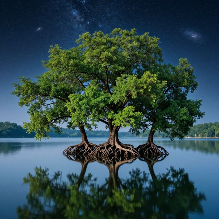 This is a highly detailed, digitally created photograph of a single, large tree with three visible trunks, rooted in calm, reflective water. The tree has lush, green leaves and visible, intricate roots extending below the water's surface. The background features a gradient sky transitioning from deep blue at the top to lighter blue near the horizon, with a faint, starry night sky visible in the upper right corner. The water is mirror-like, reflecting the tree and the sky. In the distance, there's a faint silhouette of a forested shoreline. The overall composition is symmetrical and serene, with a surreal, almost ethereal quality.