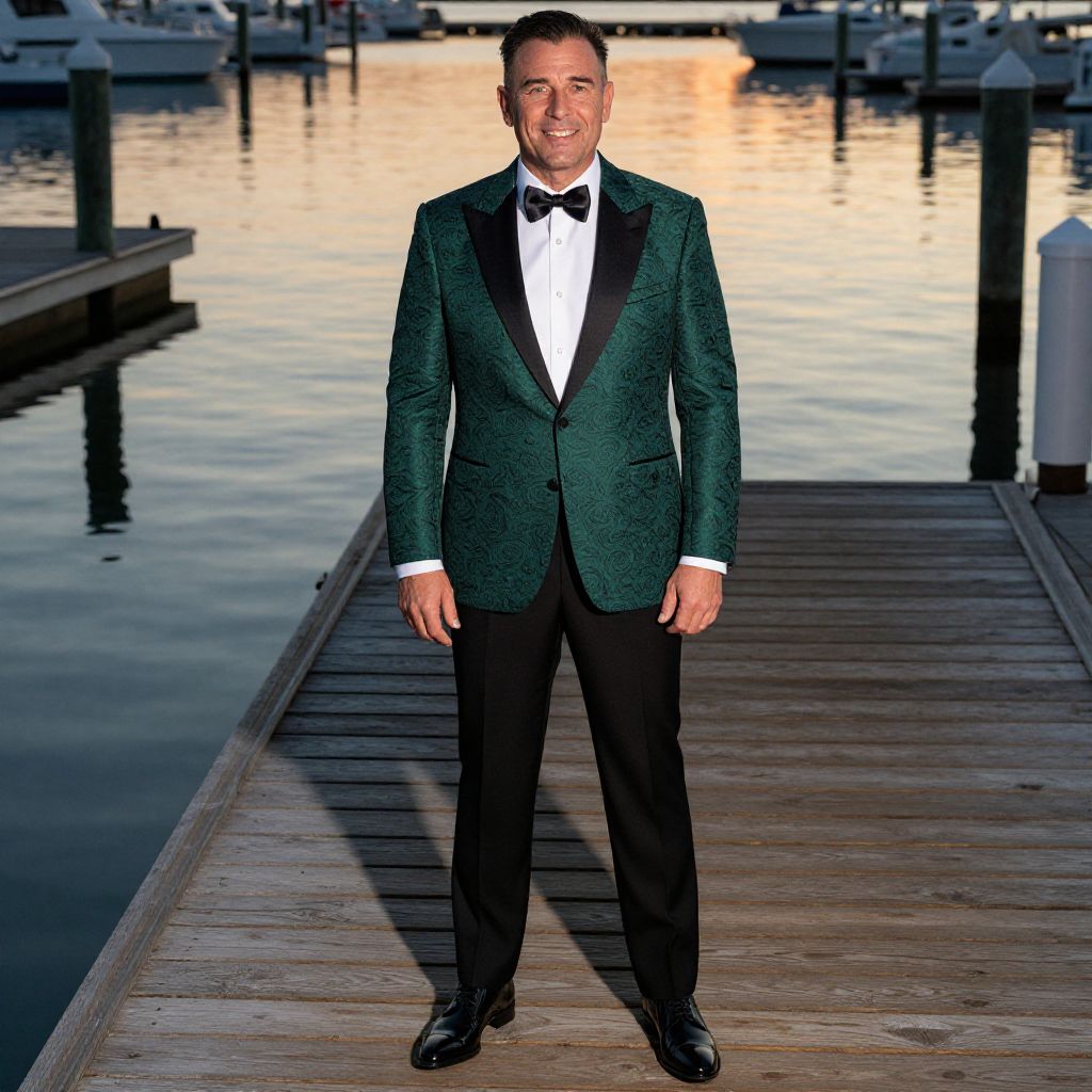 A man, emerald green paisley dinner jacket, classic white dress shirt, black silk bow tie, tailored black dress pants, glossy black derby shoes, sunset reflections, wooden docks, oversaturated film, confident smile Man has masculine face and piercing eyes