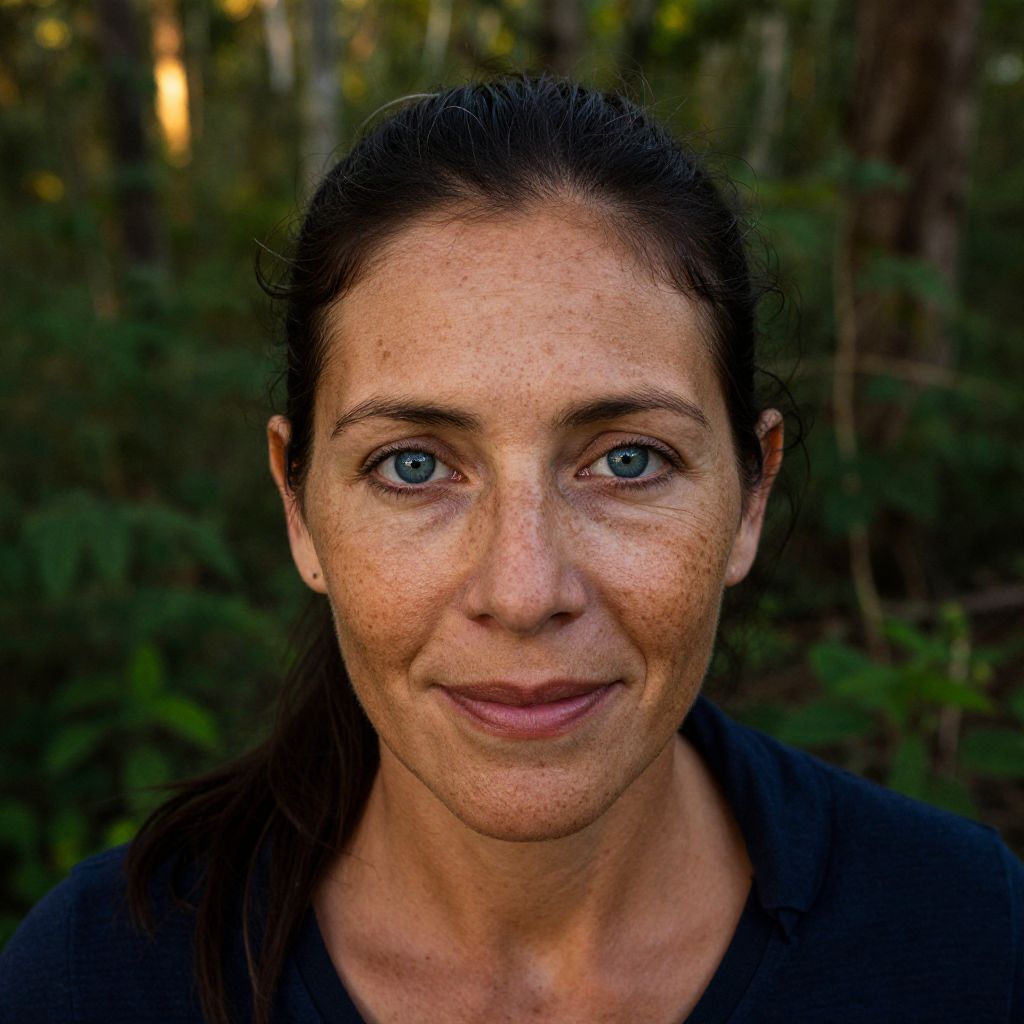 A mirrorless camera captures a photorealistic portrait of a Hispanic woman in her late 30s, showcasing striking blue eyes and a subtle smile filled with knowledge. Bathed in soft golden light filtering through the forest canopy above, her face tells tales of both hardship and joy. The aerial perspective frames her from above yet slightly behind, highlighting intricate freckles on her skin, weathered by time's embrace, against lush verdant surroundings seamlessly blending into the background. Sunlight dances across her features, evoking tranquility and resilience, weaving an emotional gradient that reflects nature's beauty and human strength in harmonious duality.