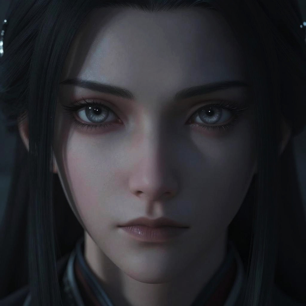 Close-up portrait of a mysterious anime figure with piercing grey eyes, dark hair framing the face, cool toned color scheme, dramatic lighting creating high contrast, cinematic and moody ambiance, highly detailed digital art.