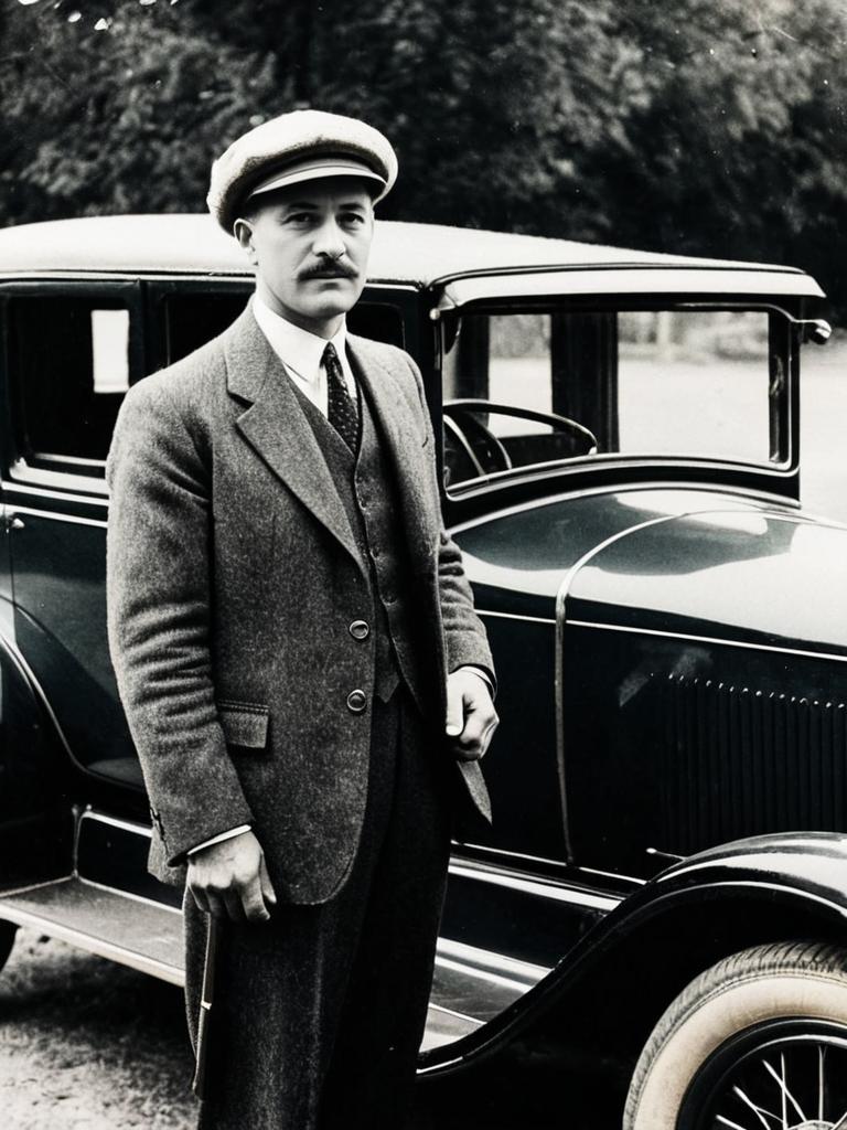 Man in 1920s Attire, photorealistic outdoor portrait with old car