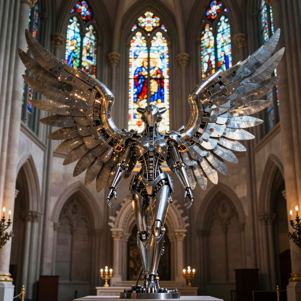 Photograph of a metallic, winged humanoid statue standing in a Gothic-style cathedral with tall, arched ceilings and large, colorful stained-glass windows. The statue, with detailed, reflective silver wings and body, stands on a pedestal at the front of the church. The background features ornate architectural details, including carved stone arches and candlelit chandeliers. The statue's wings are open wide, and its head is slightly tilted forward. The cathedral's walls are a warm beige, contrasting with the vibrant colors of the stained glass. The lighting creates a mix of natural and artificial light, highlighting the statue's metallic sheen.