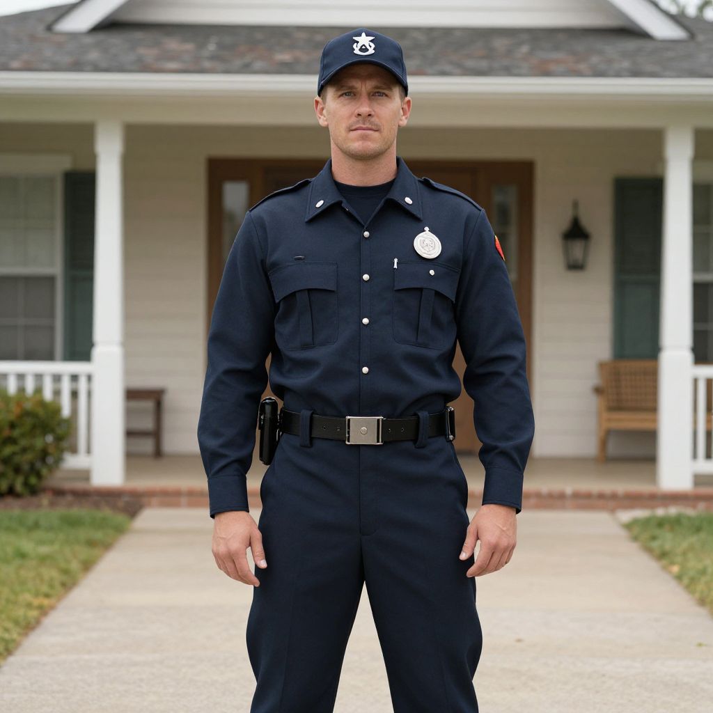 Photograph of a Caucasian male police officer standing on a concrete pathway in front of a white, two-story house with a porch. He has a strong, muscular build, short brown hair, and is wearing a dark navy blue uniform with a police badge on his left chest and a black cap with a white star emblem. His uniform includes long sleeves, buttons, and a belt with a holster. The background features a white house with dark blue shutters, a wooden door, and a black lantern on the right. The roof is shingled, and there's a wooden chair on the porch. The grass on either side of the pathway is neatly trimmed.