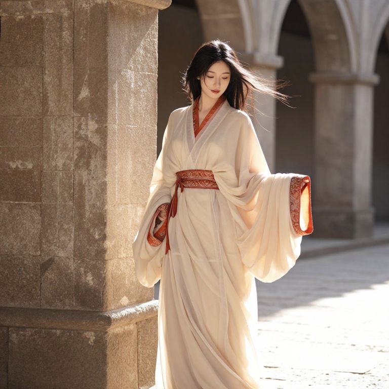 A graceful female standing in front of a weathered stone wall, wearing a flowing beige robe with soft orange accents along the hem and sleeves, and a decorative belt around her waist. Her long, flowing hair is gently tousled by the wind, and she has a serene, contemplative expression. The setting is a quiet, sunlit courtyard with sunlight filtering through ancient stone arches in the background, adding warmth and depth to the scene.