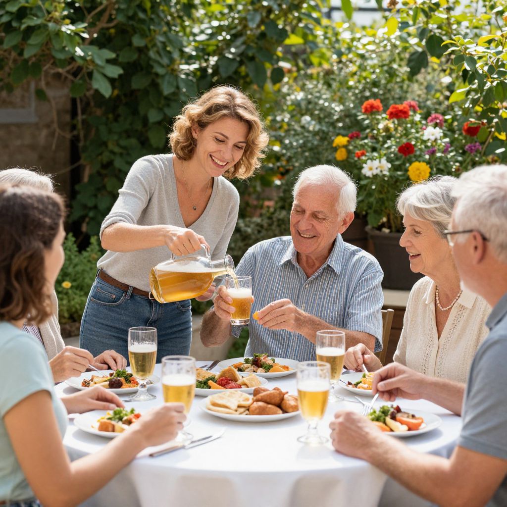 Lively gathering unfolds as a smiling woman pours a golden beverage into a glass for her elderly companion, surrounded by four others enjoying a warm meal together on a sunlit terrace, with lush greenery and vibrant flowers in the background.