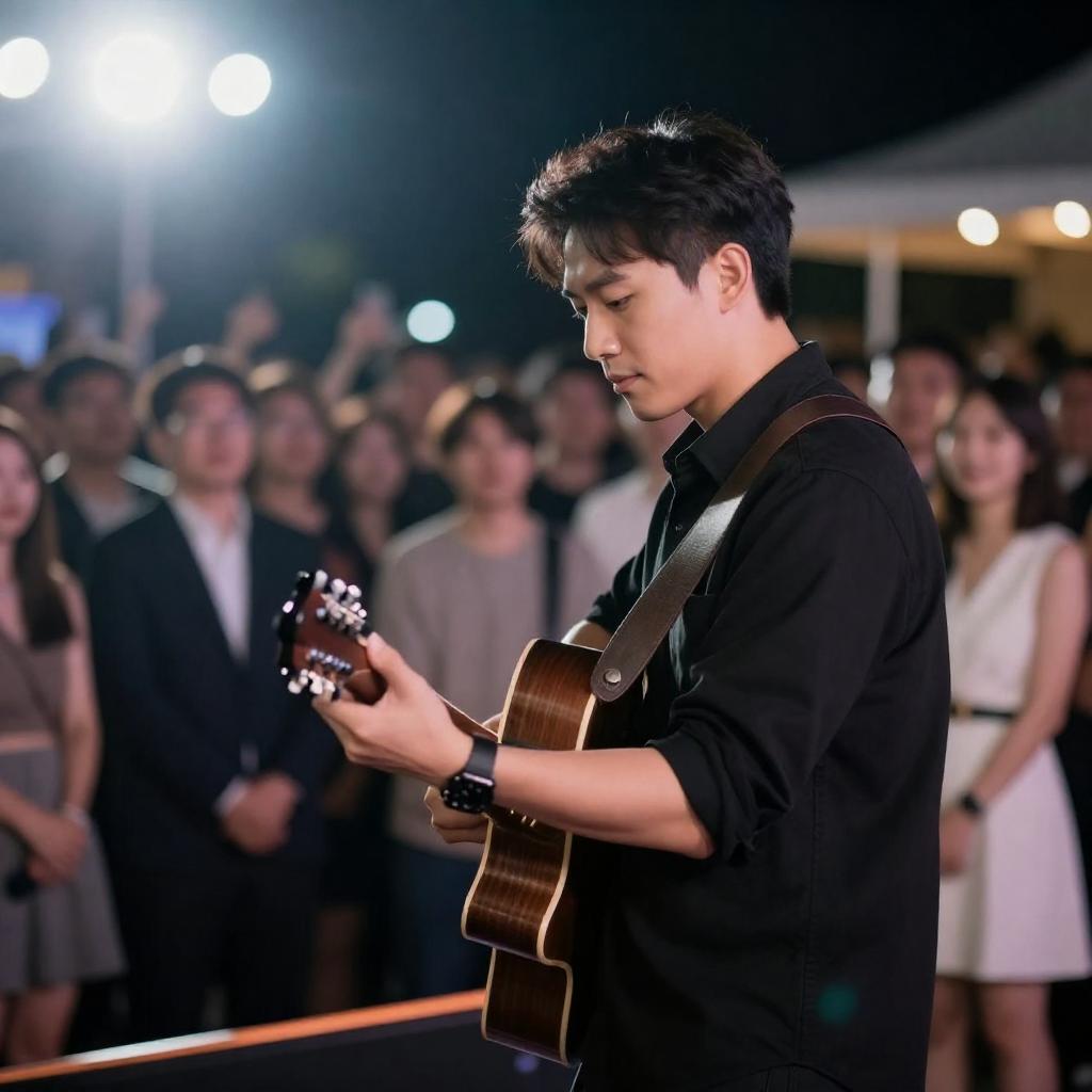 Photograph of a male musician with short dark hair, wearing a black shirt, playing an acoustic guitar on a dimly lit stage. Background includes a blurred crowd of people, some in formal attire, with bright stage lights creating a bokeh effect. A woman in a white dress stands to the right, smiling.