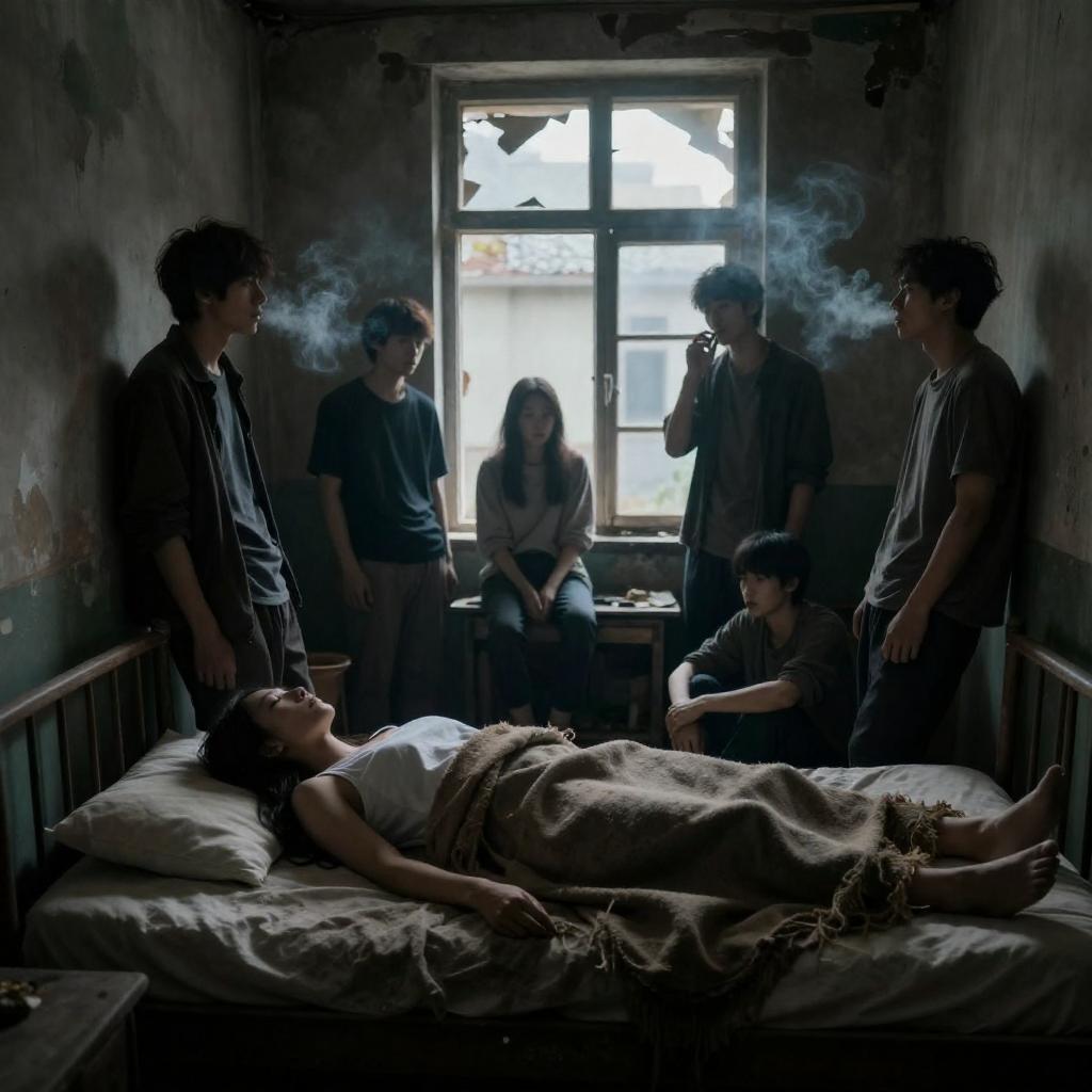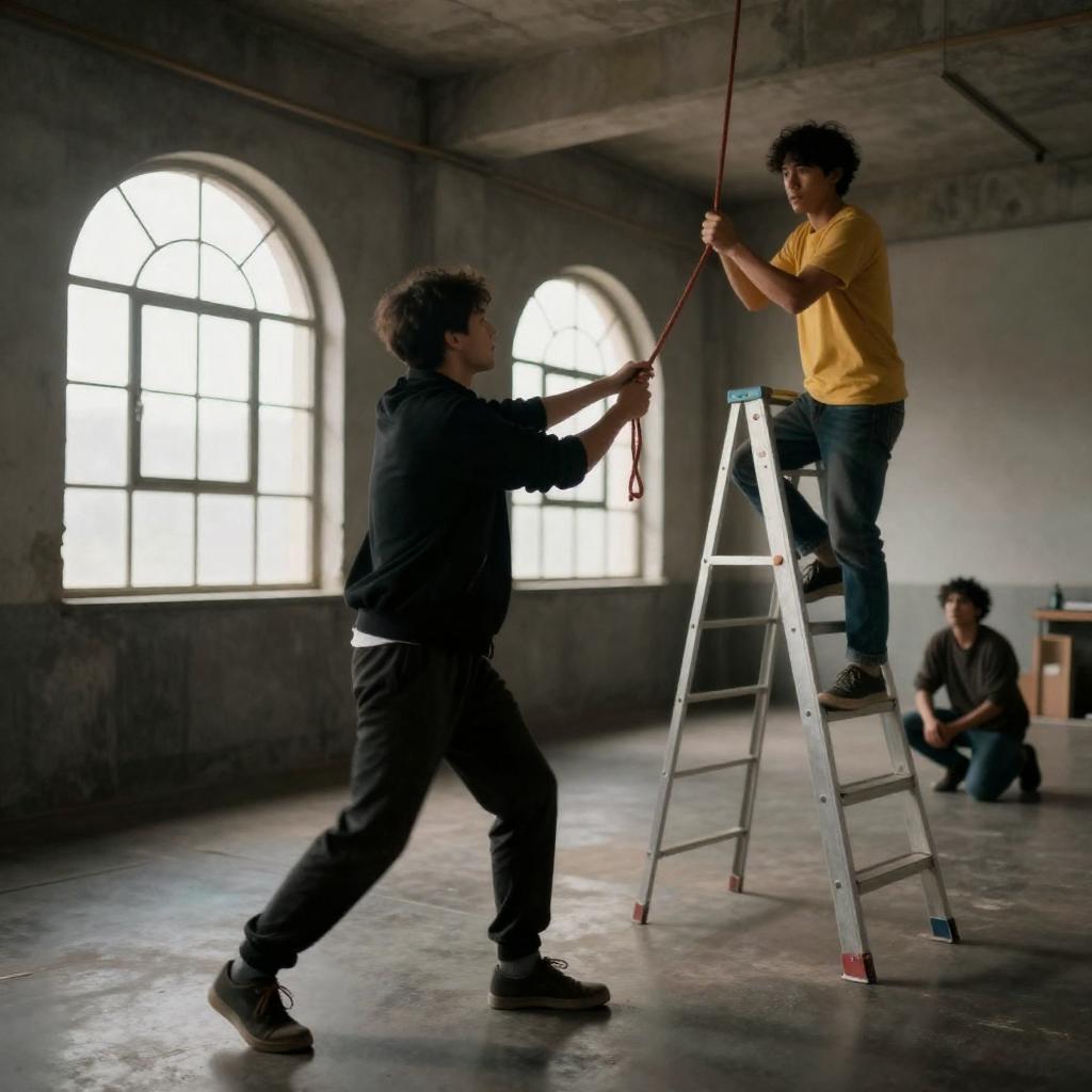 Photograph of six men in a dimly lit, rustic wooden room. Five men stand and crouch, clapping and cheering, while one man in a gray shirt and cap sits on the floor in the foreground. Warm light filters through a window on the right, casting shadows. The men wear casual clothes, and wooden chairs are scattered around.