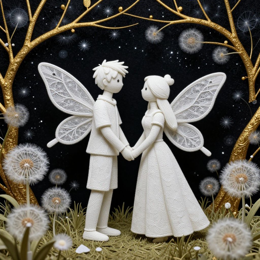 Photograph of two white, knitted, fairy-like dolls with intricate lace wings holding hands. The male doll has spiky hair and wears a simple shirt and pants, while the female doll has a bun and a long, flowing dress. They stand in a grassy area surrounded by golden, leafless trees and dandelions, set against a dark, starry night sky. The delicate lace wings and dandelions add a whimsical, fairy-tale quality to the scene. The golden trees contrast with the dark background, enhancing the magical atmosphere.