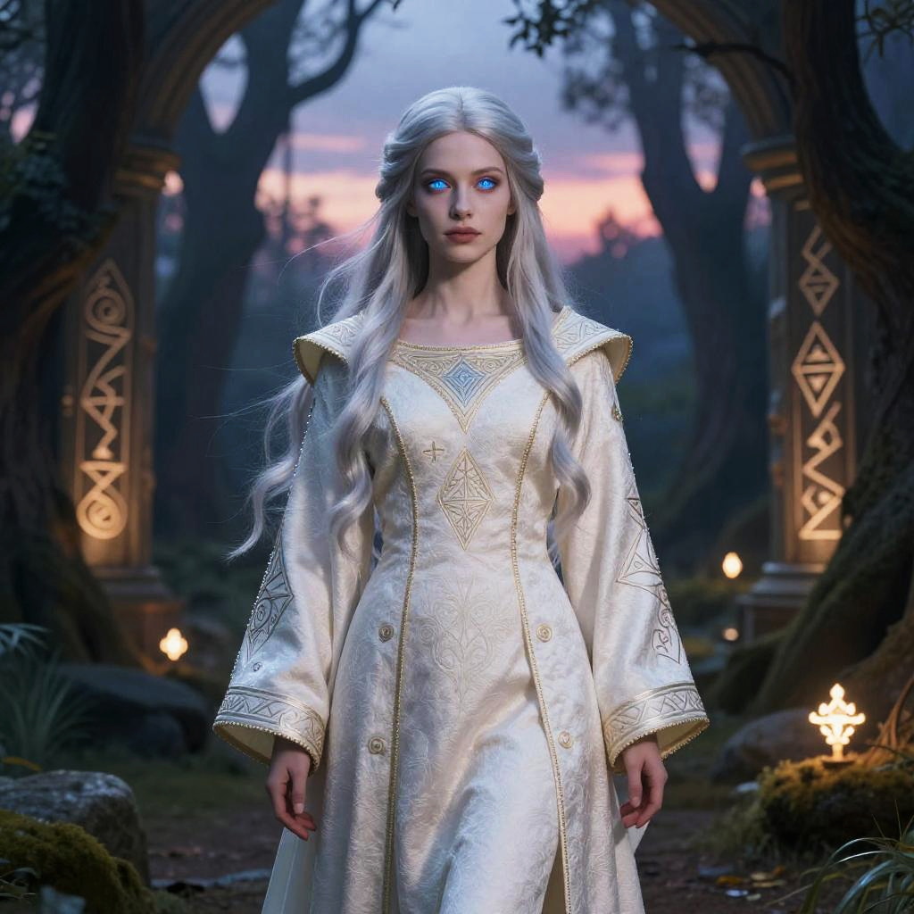 Ranni human form, a mysterious fantasy character with ethereal blue eyes and flowing silver hair, wearing elegant medieval robes adorned with intricate arcane symbols, standing in an ancient enchanted forest under a twilight sky with glowing runes.
