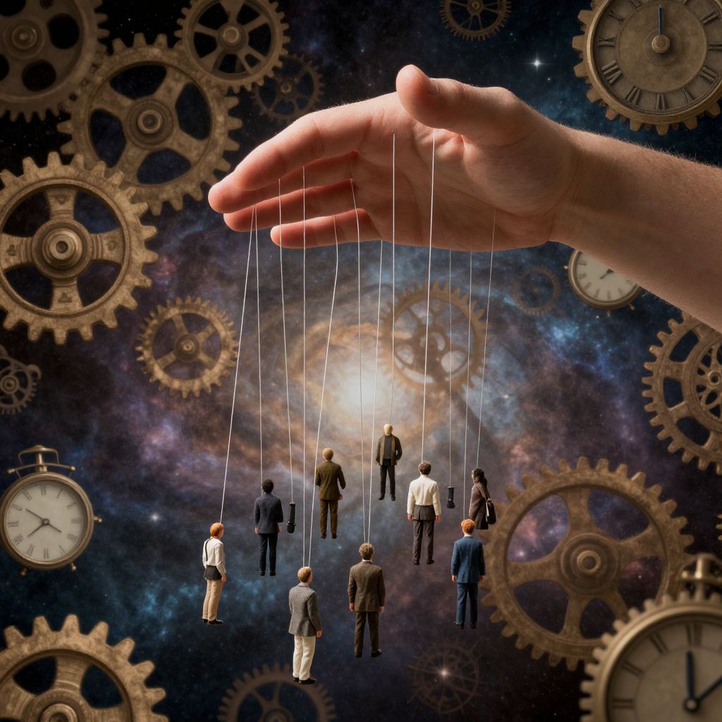 Mandate visualized as an abstract concept with an immense hand of authority holding strings attached to tiny human figures, in a vast cosmic background of floating gears and clocks, symbolizing control and destiny, richly detailed and textured.