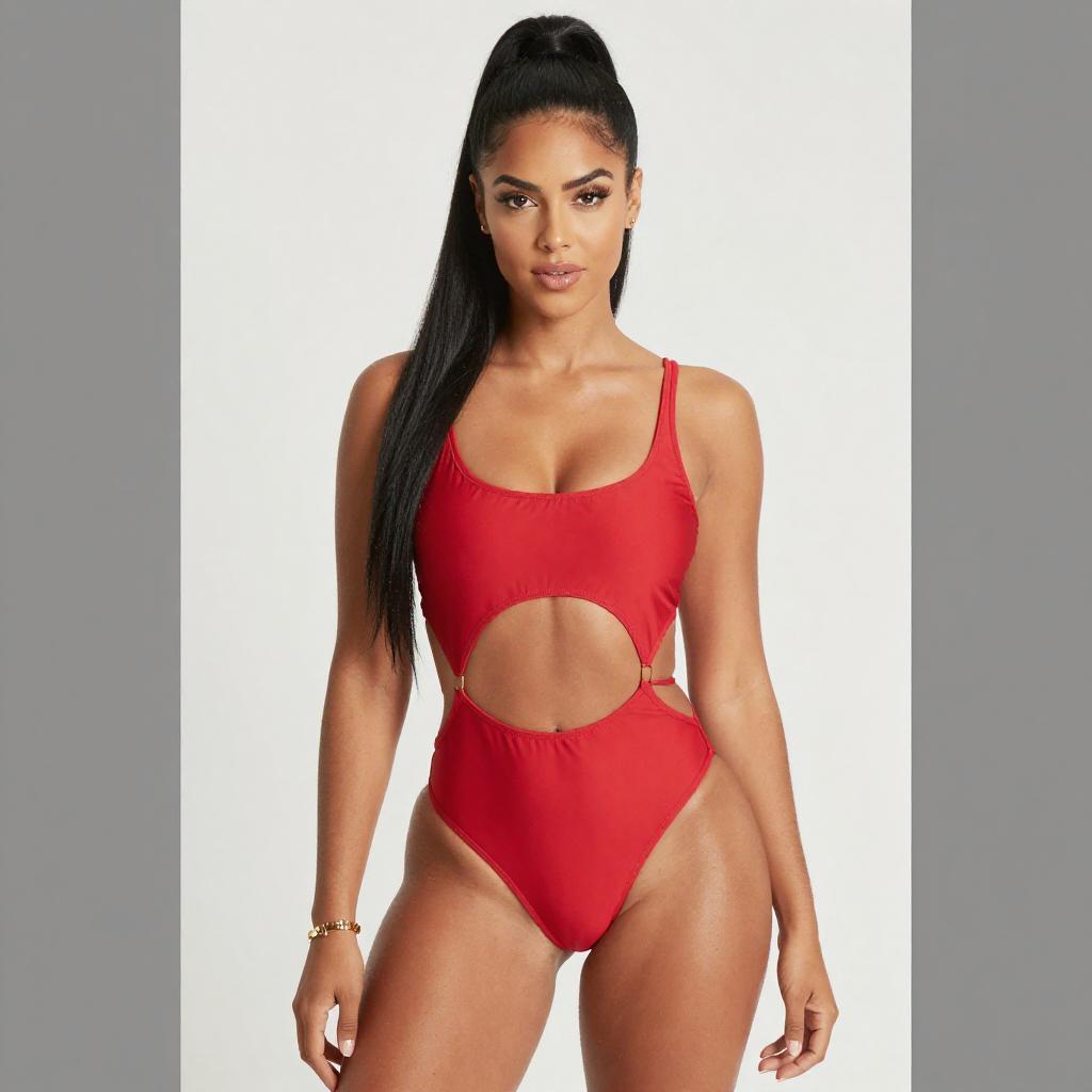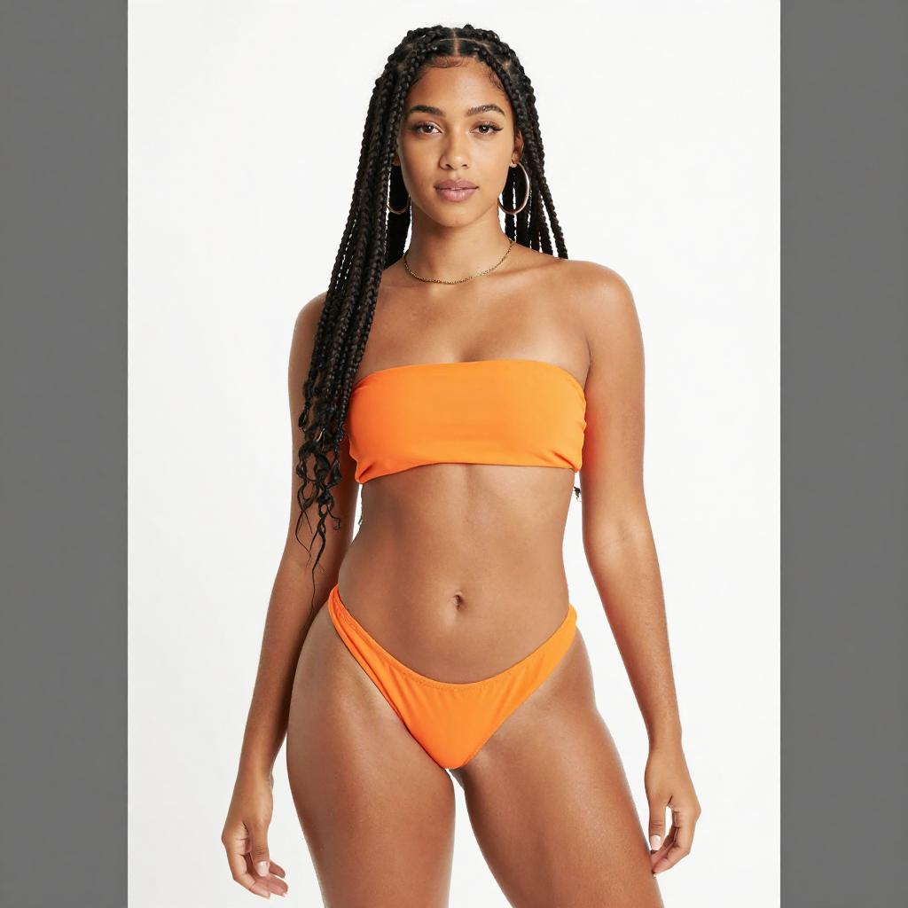 Photograph of a woman with medium brown skin and straight black hair, wearing a neon green bikini. She has a tattoo on her right wrist and a small navel piercing. She stands confidently against a white background with gray borders on either side. Her bikini top is a bandeau style, and the bottoms are high-cut.