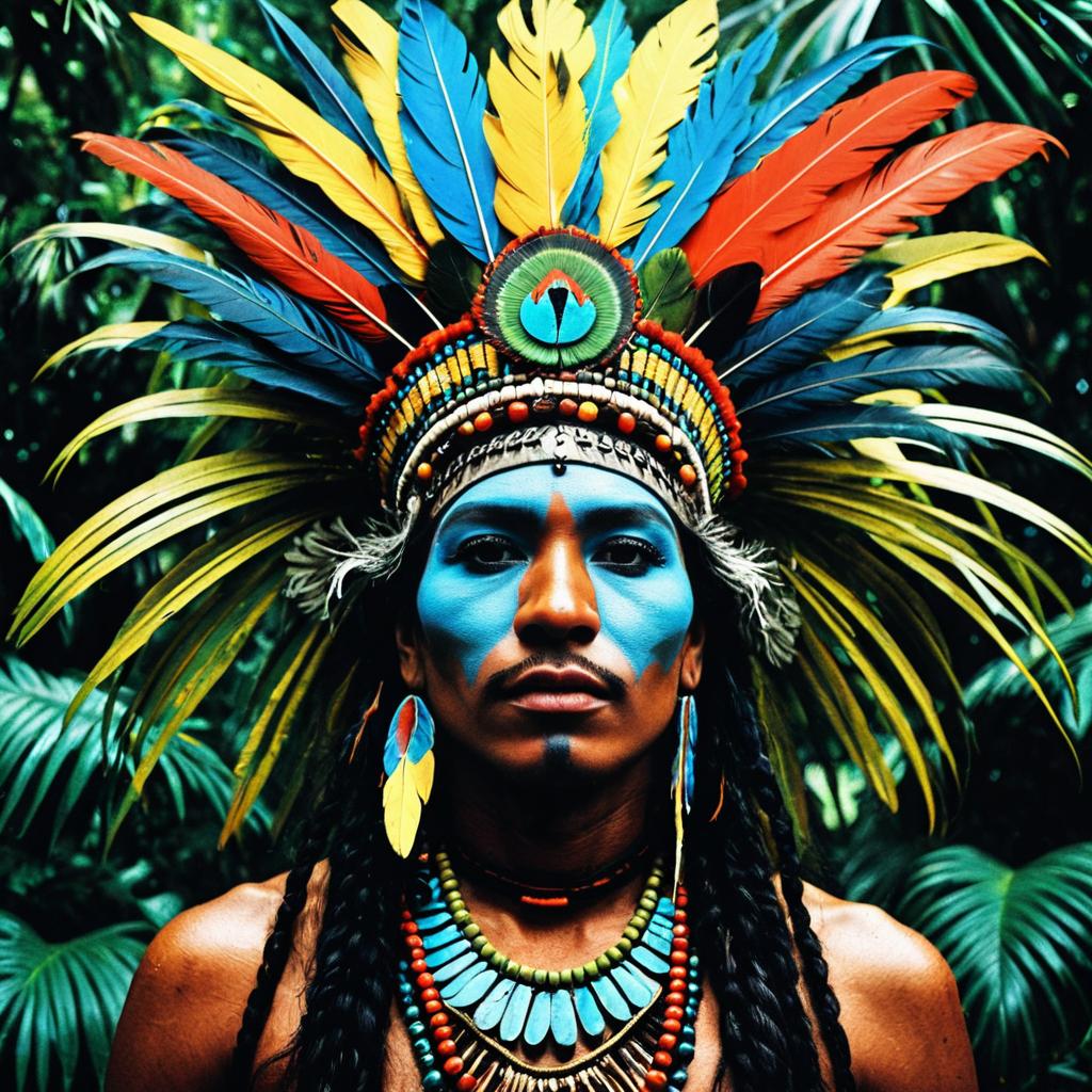 A Brazilian carnival queen wearing an ornate feathered mask featuring blue, red, and yellow feathers, paired with a sparkling teal sequined outfit. She has curly black hair and vibrant red lipstick, accessorized with matching blue and gold jewelry. The background shows a bright confetti explosion in a colorful pop art style.