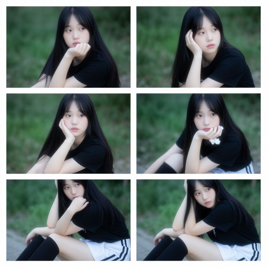This image is a collage of six photographs of an East Asian woman with long, straight black hair, wearing a black t-shirt and white shorts with black stripes. She's sitting outdoors on a grassy area, with a blurred green background. Her expressions vary from thoughtful to slightly pensive, and she's often resting her chin on her hand or her lips. She wears knee-high black socks and looks directly at the camera. The photos have a soft, slightly overexposed look.