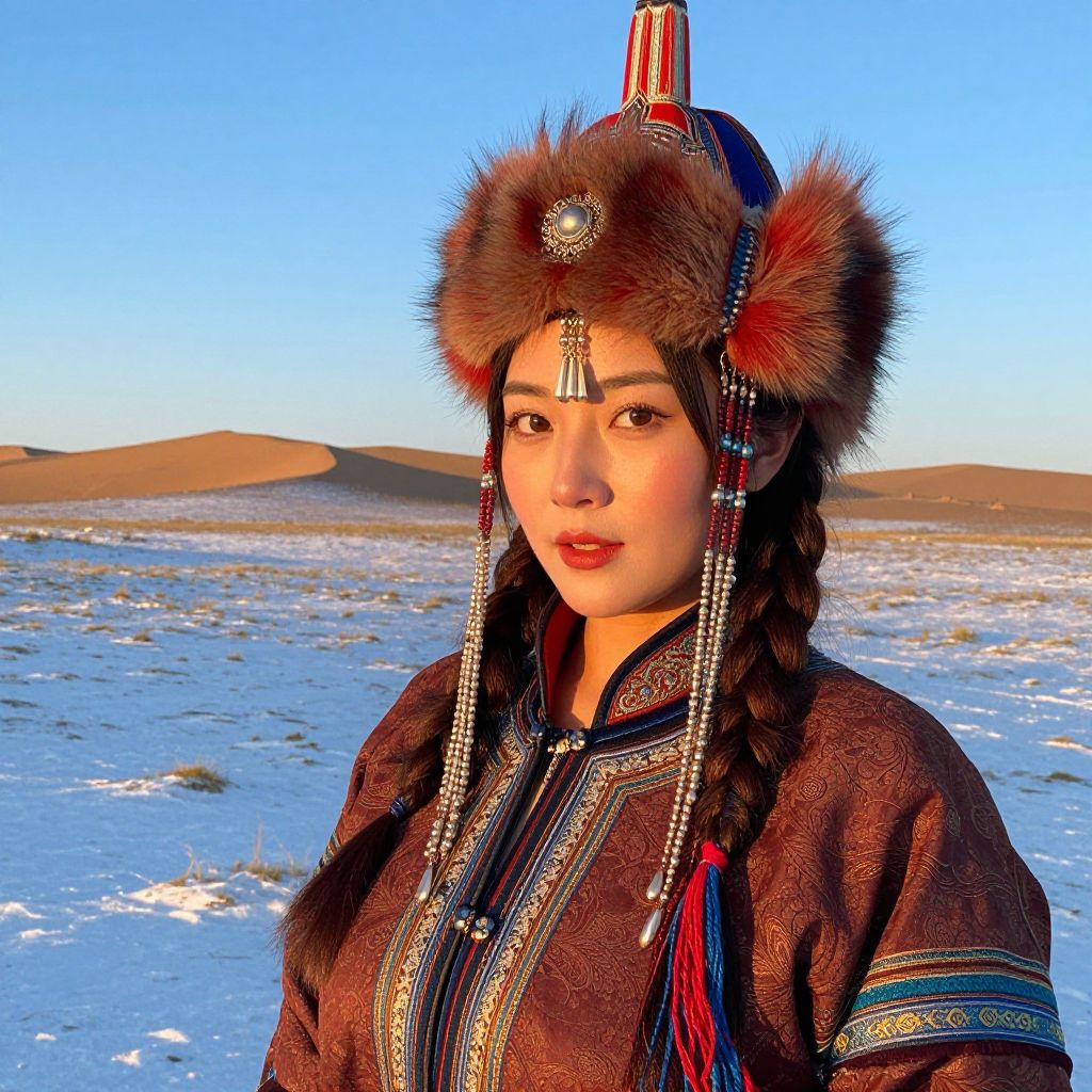 Photograph of an Asian woman with braided hair, wearing traditional Mongolian attire, fur hat, and intricate embroidery, standing in a snowy desert landscape