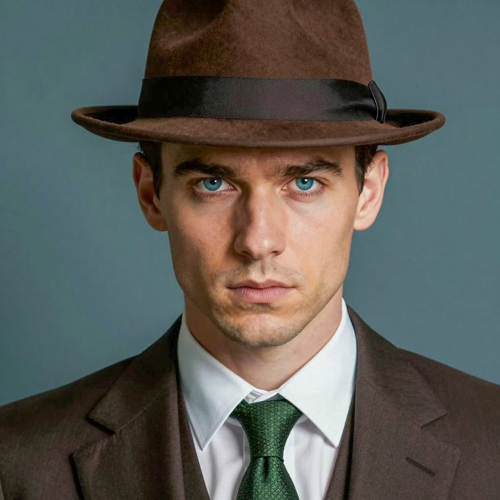 Man with fair skin, dark hair, and brown eyes wears a gray suit, white shirt, and patterned tie. He gazes to the right with a neutral expression. Background features three lit candles, one in the foreground and two in the background.