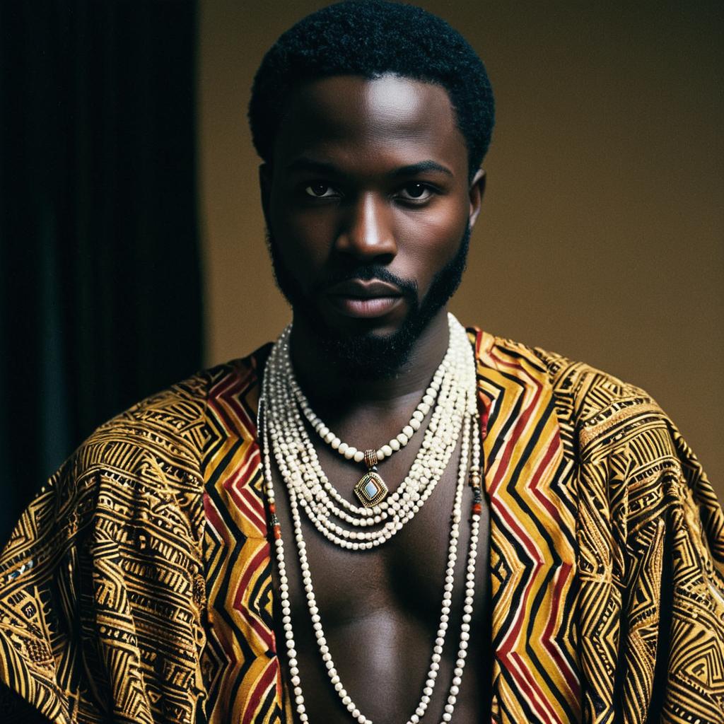 Portrait of a confident African man wearing traditional patterned African robe and multiple layered white beaded necklaces. He has a short beard and curly hair, looking directly at the camera, highlighting cultural fashion and jewelry.