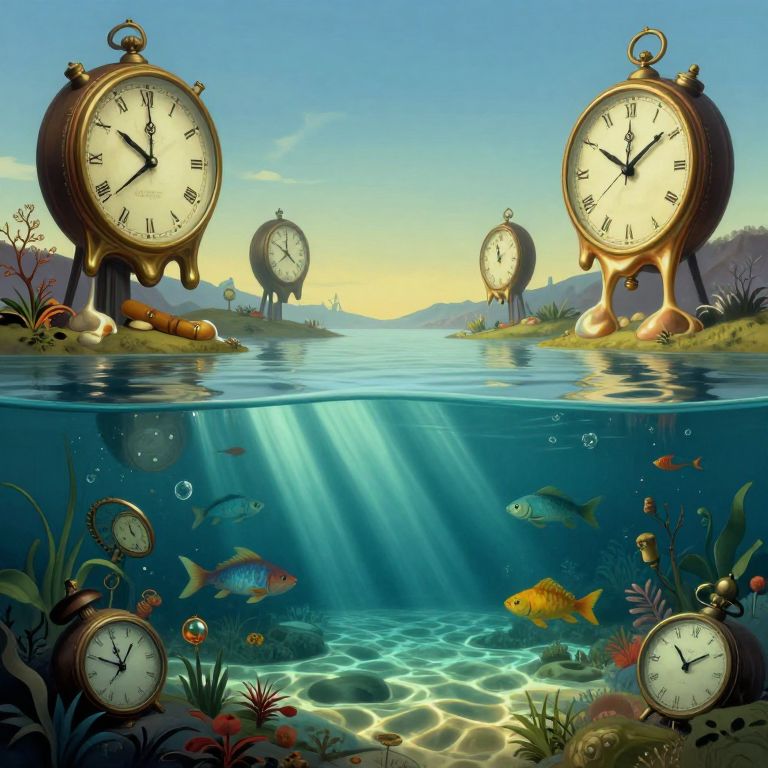 Craft an image embodying the surrealistic style synonymous with Dali's oeuvre, depicting a dreamlike landscape where clocks reminiscent of melting timepieces loom over a placid lake. From this unique aquatic vantage point, peer beneath the water's surface to discover an enchanting underwater realm where fish and flora intermingle with clockwork components. As sunlight filters through the water, it casts otherworldly shadows that dance across the scene, simultaneously invoking curiosity and serenity in this harmonious fusion of time and nature.