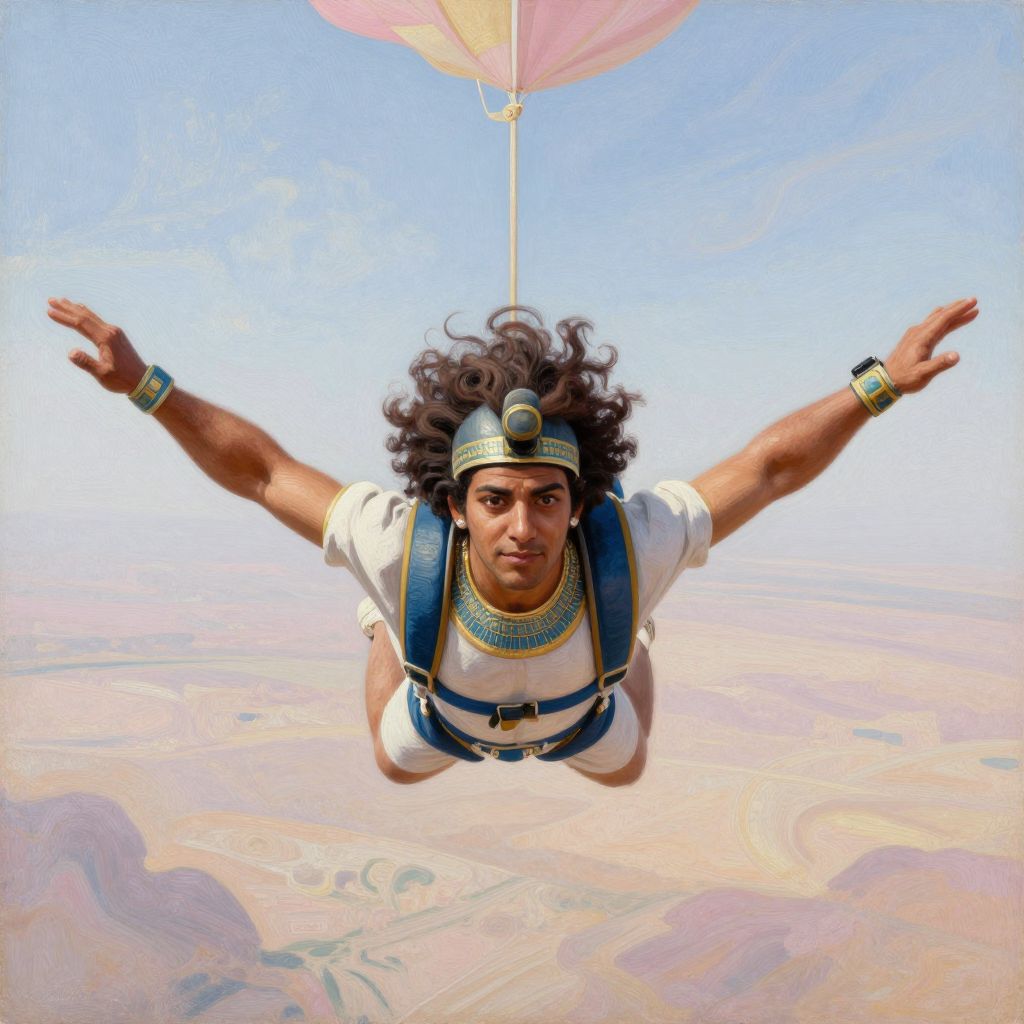 Photograph-style digital artwork of a muscular, curly-haired man with an African complexion, wearing ancient Egyptian attire, parachuting above a cloudy sky.