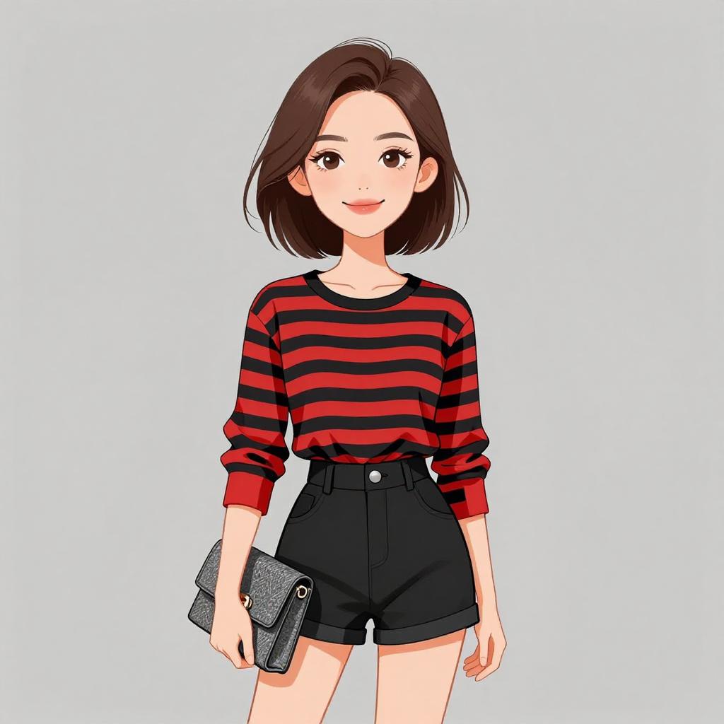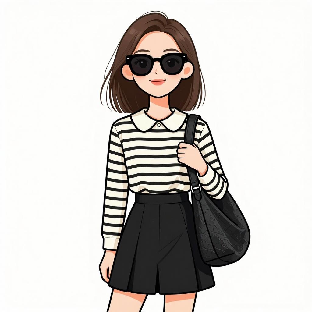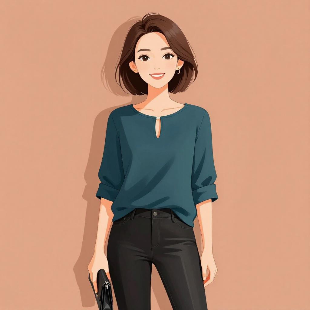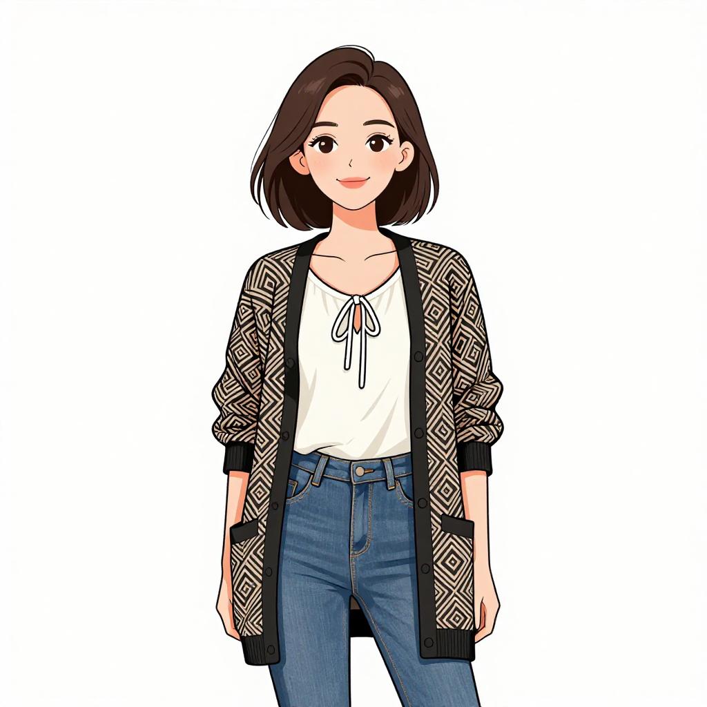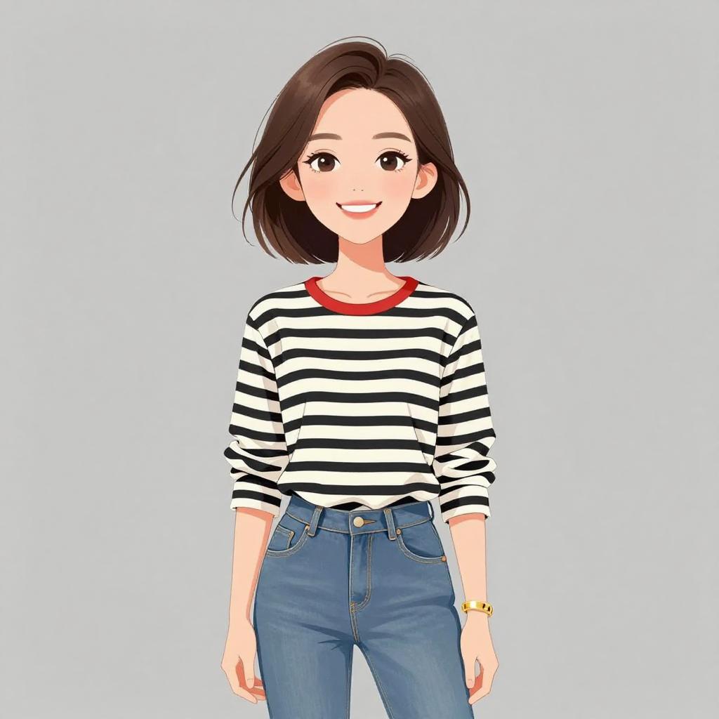 Woman with pretty face and pretty hair. smiling Woman, casual, navy blue and white chevron pattern top, V-neckline, three-quarter length sleeves with button tab detail, gray skinny jeans, tan shoulder bag with chain strap and zipper detail. --sref 1467