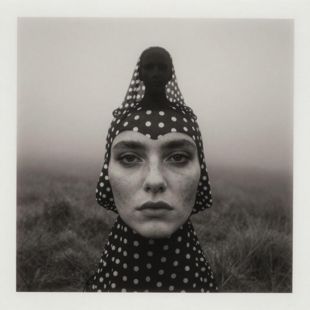 Black-and-white photograph of a young woman with fair skin and freckles, wearing a polka dot headscarf with a pointed top. Her expression is neutral, with slightly parted lips and direct eye contact with the camera. The background is a foggy, grassy field, creating a soft, blurred effect. The headscarf's pattern contrasts sharply against her pale skin. The image has a moody, surreal quality, with a focus on the woman's face and the distinctive headscarf. The photograph is framed with a white border.