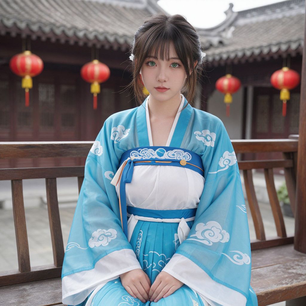 A young woman with expressive green eyes and fair skin dressed in a vibrant Hanfu outfit featuring blue and white cloud patterns, sitting on a wooden bench in a scenic Chinese courtyard with red lanterns and tiled roofs, detailed fabric textures and realistic lighting. The woman has big tits and cute face