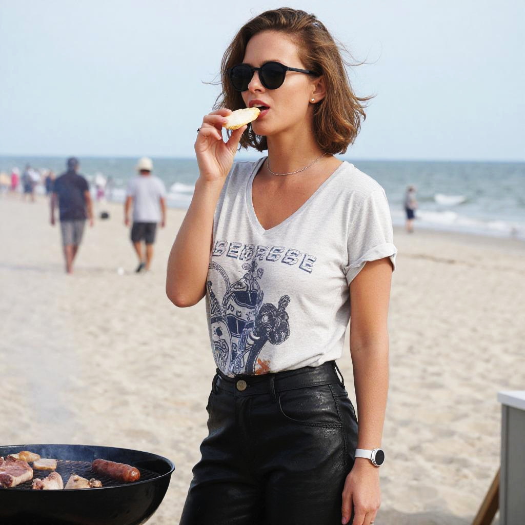 A woman in a casual chic style, wearing a loose grey V-neck T-shirt with a graphic print and snug black faux leather pants, dark round sunglasses, and a slim silver wristwatch, enjoying a BBQ gathering at the beach, in the visual style of Audrey Flack. Sexy. Pretty face and beаutiful eyes. Big breasts