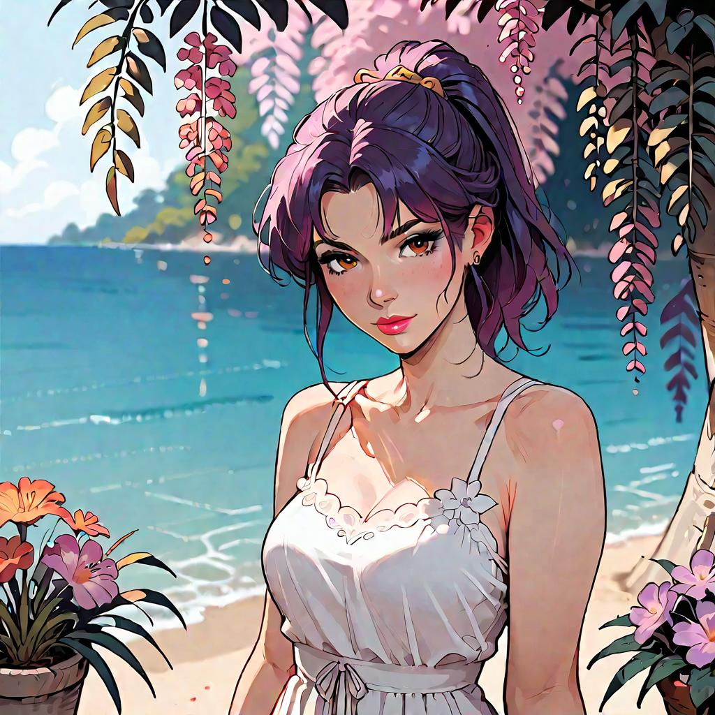 Score_9, score_8_up, score_7_up, score_6_up, score_5_up, score_4_up, source_anime, anime screencap, rating_explicit, 1girl, solo, earrings, painted nails, choker, ((full body)), beach background, standing, barefoot, midriff, floral print, wearing edgPalazzo_pants, stylish print