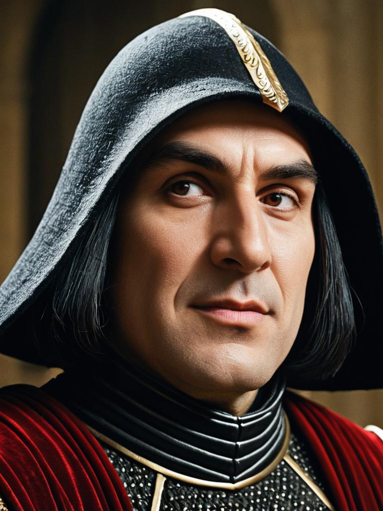 Close-up headshot of a man wearing a detailed blue Lord Farquaad style interval costume hat with a golden emblem. The man has sharp facial features, brown eyes, and medium-length black hair. The image captures detailed textures of the hat and the man's serious expression.
