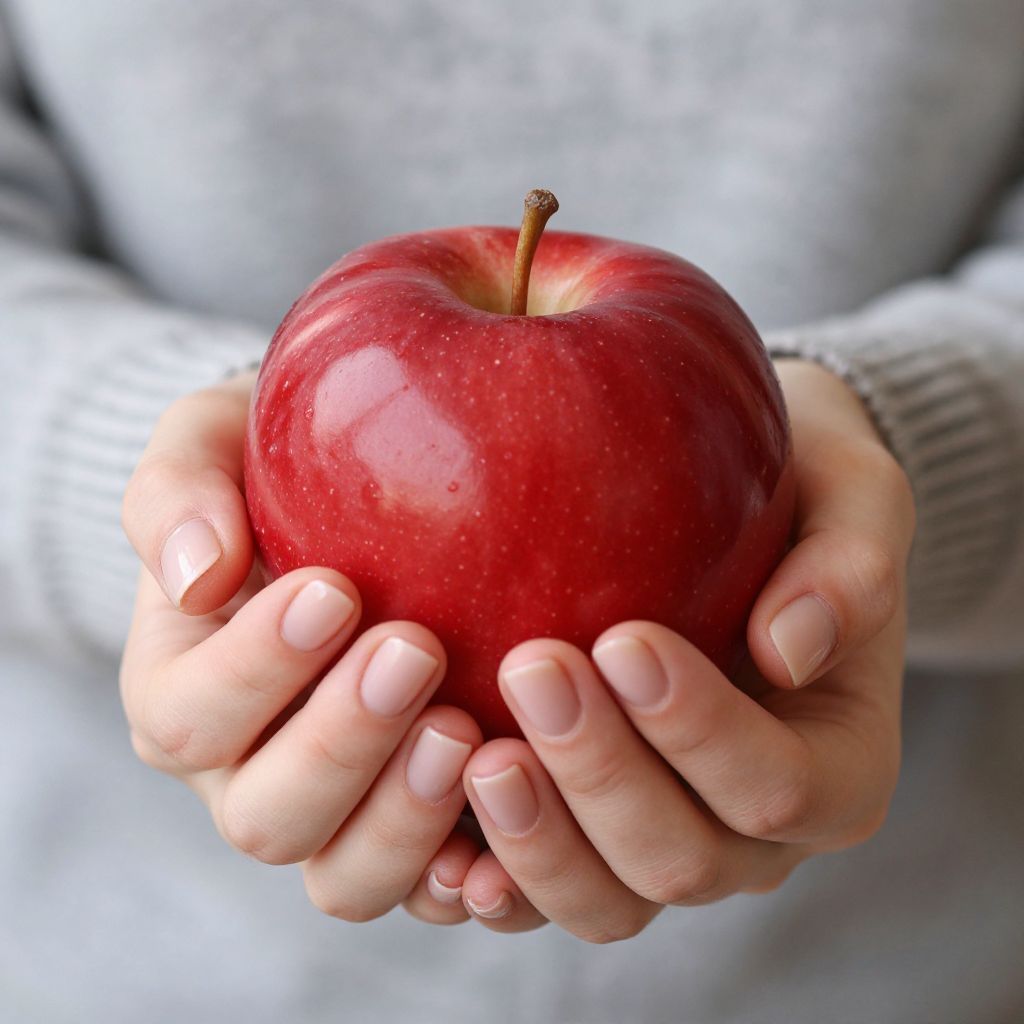Woman tenderly cradling a vibrant red apple with a short stem, showcasing neatly manicured nails against a soft, textured sweater sleeve.