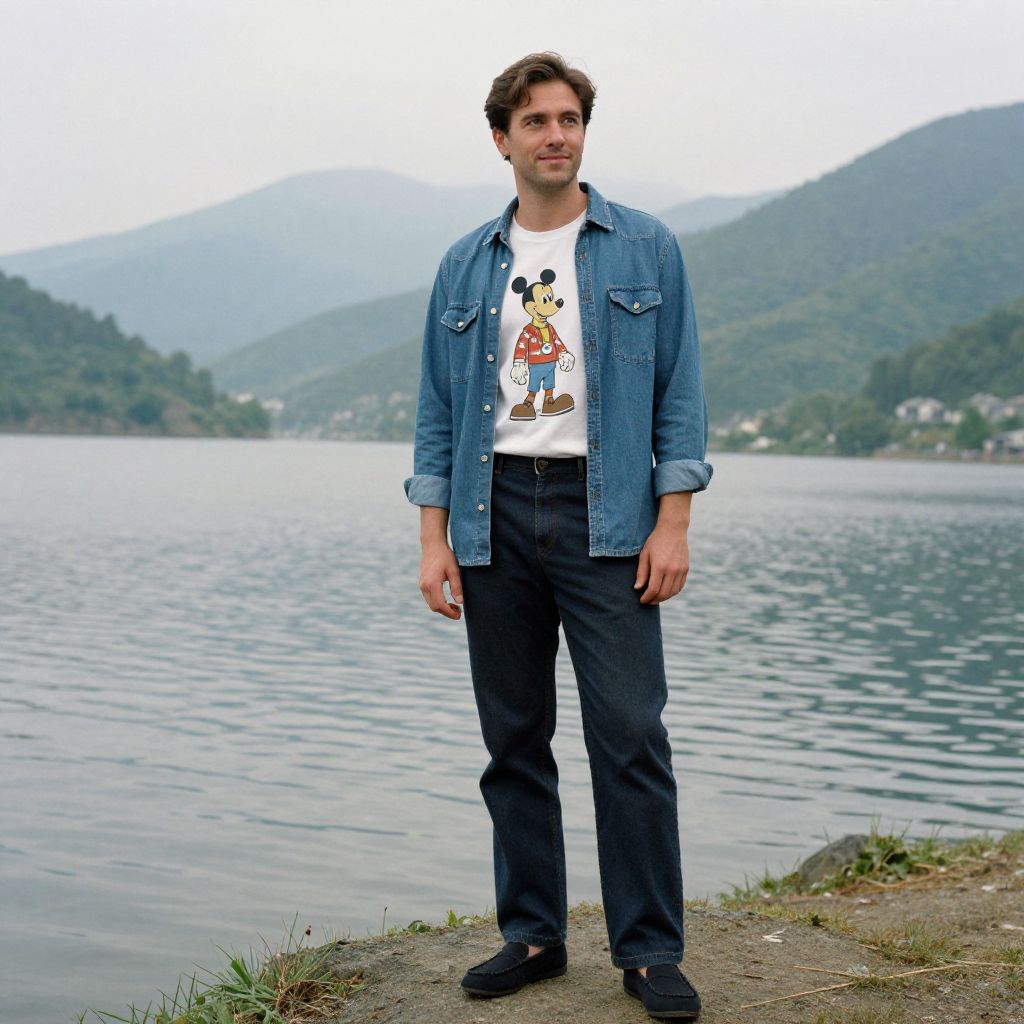 A man, retro alternative outfit, army green field jacket, striped long-sleeve shirt, high-waisted blue denim, classic white canvas shoes, serene mountain valley, misty morning light, lomography analog photo, relaxed expression, nostalgic vibe. Man has masculine face and piercing eyes