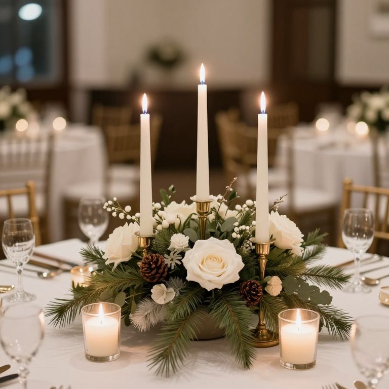 Chic winter-themed wedding centerpiece featuring three tall white candles in golden holders, surrounded by white roses, pine cones, eucalyptus leaves, and festive greenery. The elegant floral arrangement is set on a white tablecloth with additional votive candles, wine glasses, and gold chiavari chairs in a softly lit reception room.