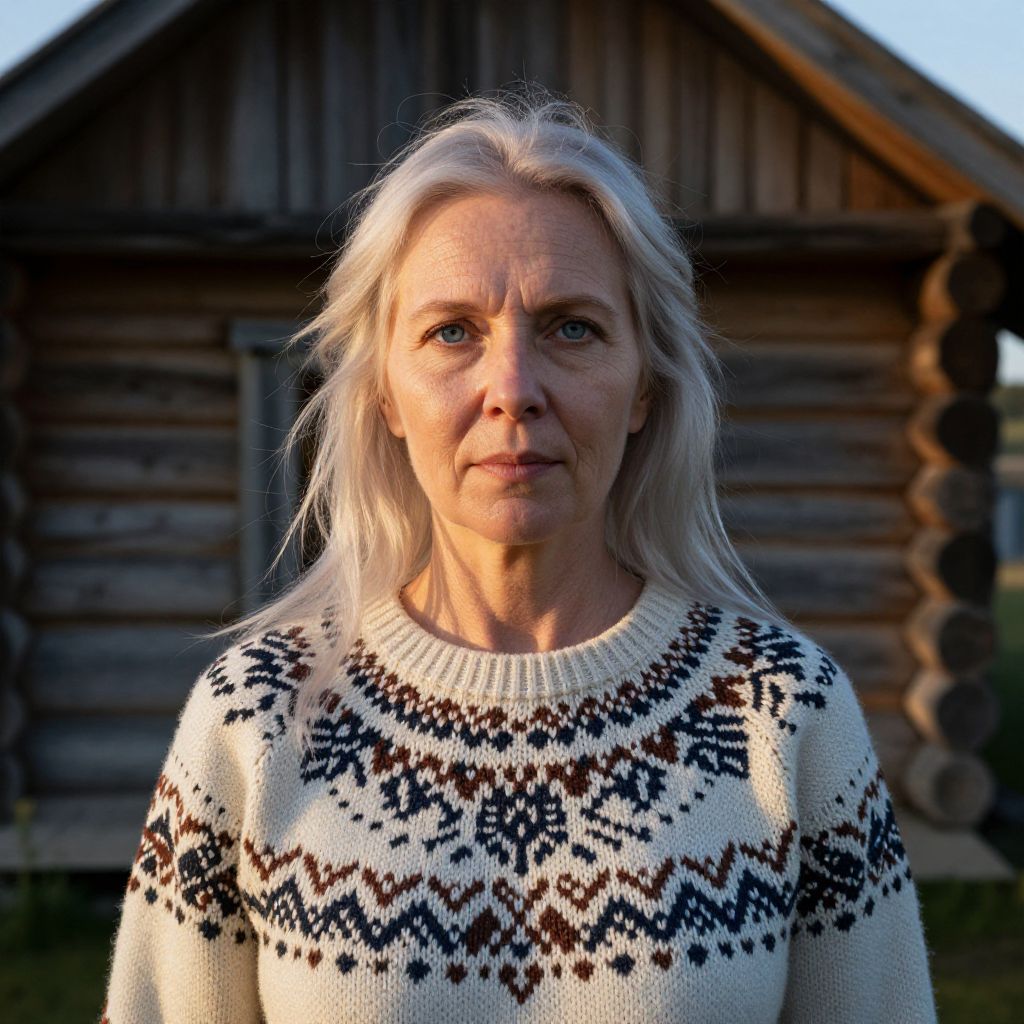 Photograph of an older woman with long white hair, wearing a white Nordic-patterned sweater, standing in front of a wooden log cabin. Natural light