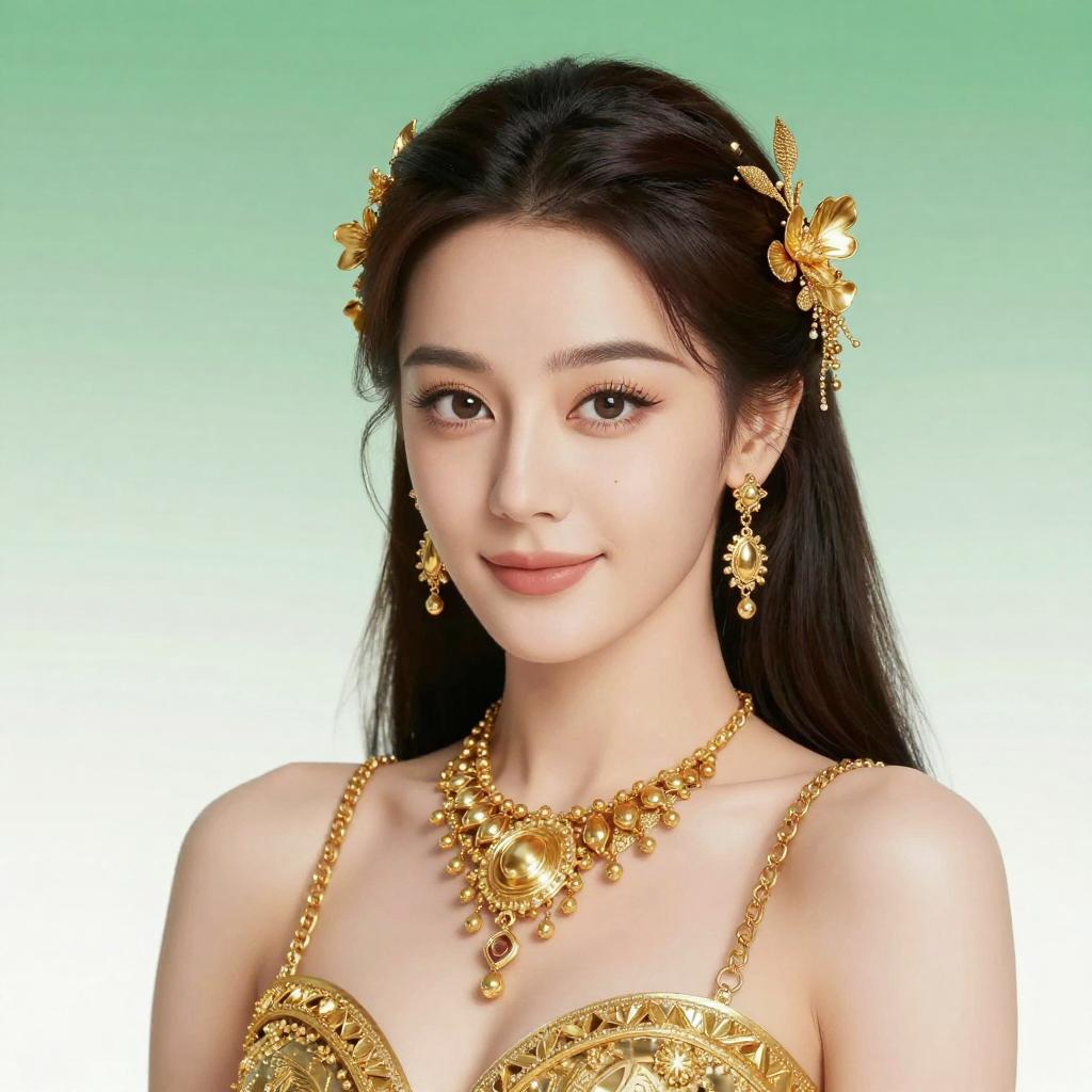 This digital illustration features a beautiful woman with dark, sleek hair adorned with a golden floral headpiece. She's wearing an elaborate gold necklace, matching earrings, and a detailed gold top. Her eyes are large and expressive, with a subtle smile on her face. The background is a gradient of green and white, making her golden attire stand out. The overall style is vibrant and slightly exaggerated, with a focus on luxury and elegance.