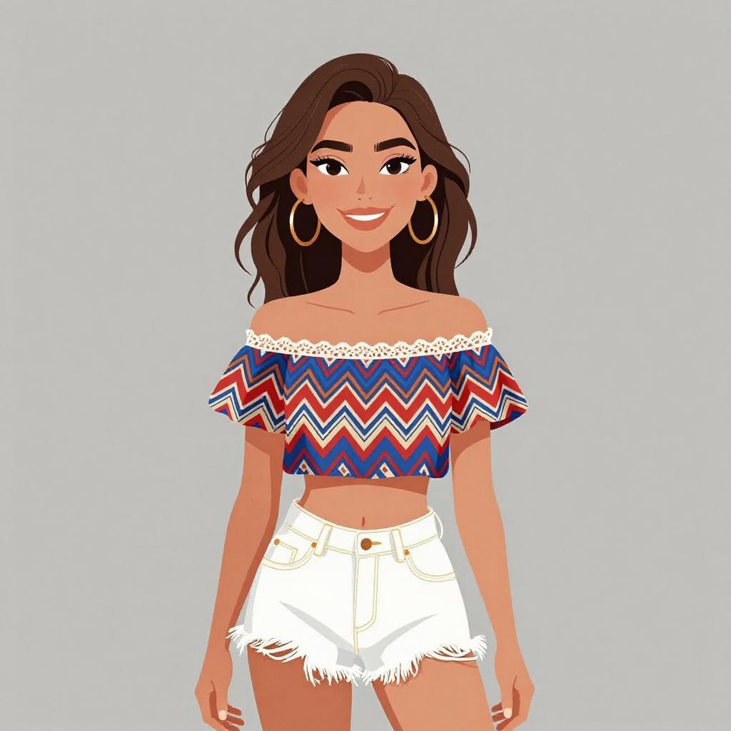 Woman with pretty face and pretty hair. smiling Woman, bohemian, off-the-shoulder top with ruffle overlay, zigzag and geometric print in red, blue, and cream tones, lace trim along the neckline, short flutter sleeves, paired with white denim cut-off shorts, frayed hem. --sref 1467
