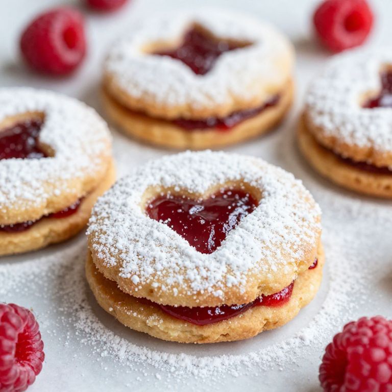 Photograph of sugar-dusted heart-shaped jam cookies with vibrant red raspberry jam, surrounded by fresh raspberries on a white surface.