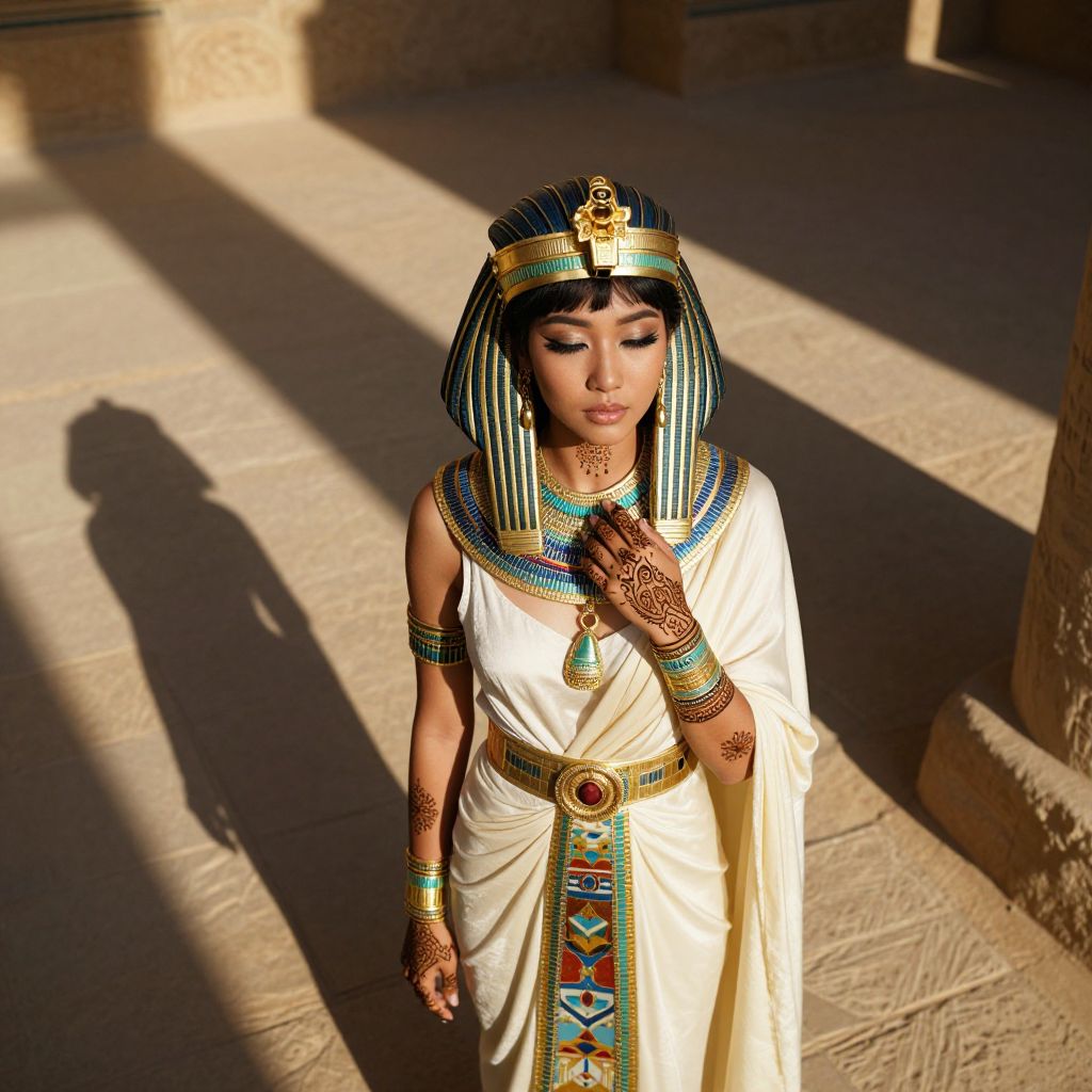 Artfully blending ancient Egyptian mystique with contemporary chic, imagine a captivating portrait of an enchanting young East Asian woman adorned in intricate henna patterns and crowned in gold. Standing amidst elongated shadows cast by otherworldly light on ancient ruins, her half-lidded gaze exudes both mystery and modern confidence. Draped in flowing historical royal attire enhanced with bold geometric patterns, the unique perspective from above reveals the fine details of her jewelry and garments—a seamless fusion of timeless elegance and dynamic fashion. This portrait tells a captivating visual story, seamlessly merging ancient Egypt's allure with today's style.