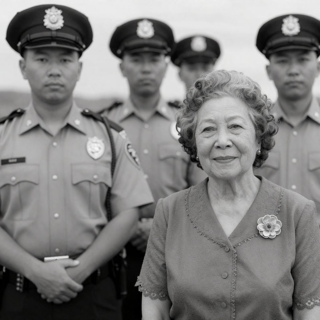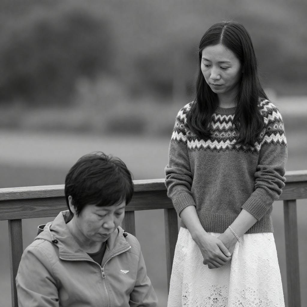 Black-and-white photograph of an Asian woman with glasses and a headband, wearing a buttoned jacket with a brooch, standing in front of dense foliage. In the background, a large, shadowy creature with a glowing eye and outstretched arms emerges from the bushes. The woman looks slightly to the side with a neutral expression. The creature's face is partially obscured by shadows and foliage.