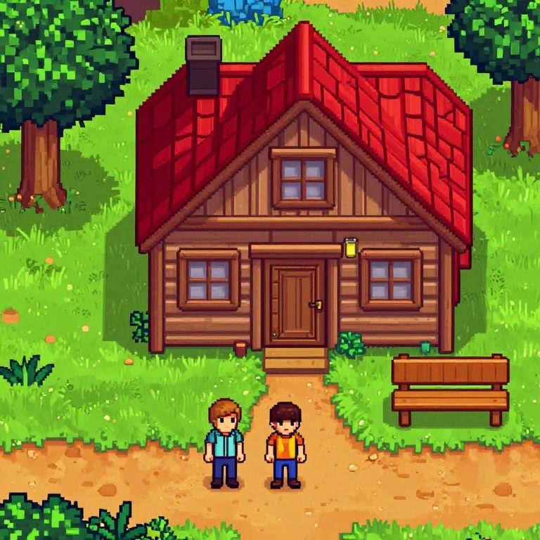 A charming pixel art scene from *Stardew Valley* depicts two characters standing on a dirt path near a quaint wooden cabin with a red roof, surrounded by lush greenery and a rustic bench, capturing the nostalgic and immersive atmosphere of this beloved mobile game.