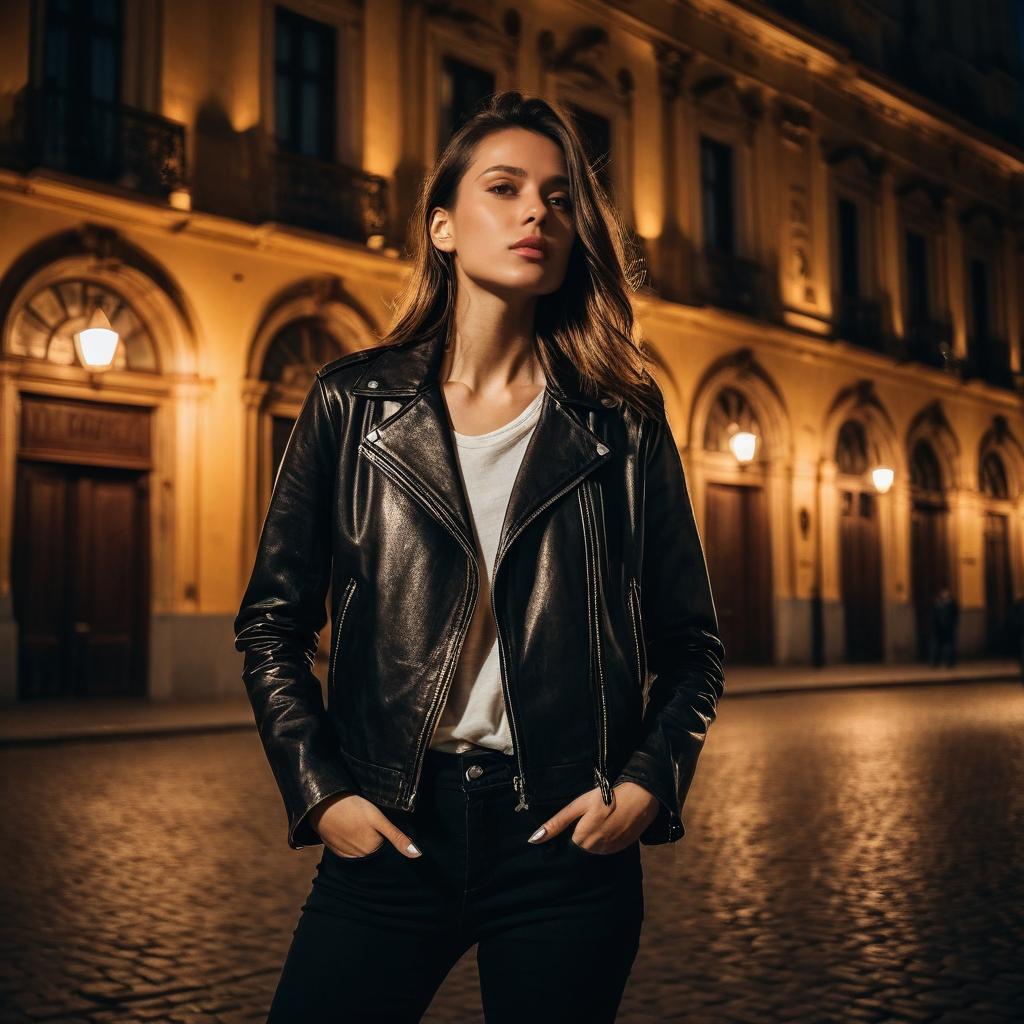 A young woman stands confidently on a cobblestone street at night, illuminated by warm streetlights. She wears a stylish black leather jacket over a white shirt and black jeans. The background features classic European architecture with beige and brown tones, exuding a mysterious and elegant urban ambiance.