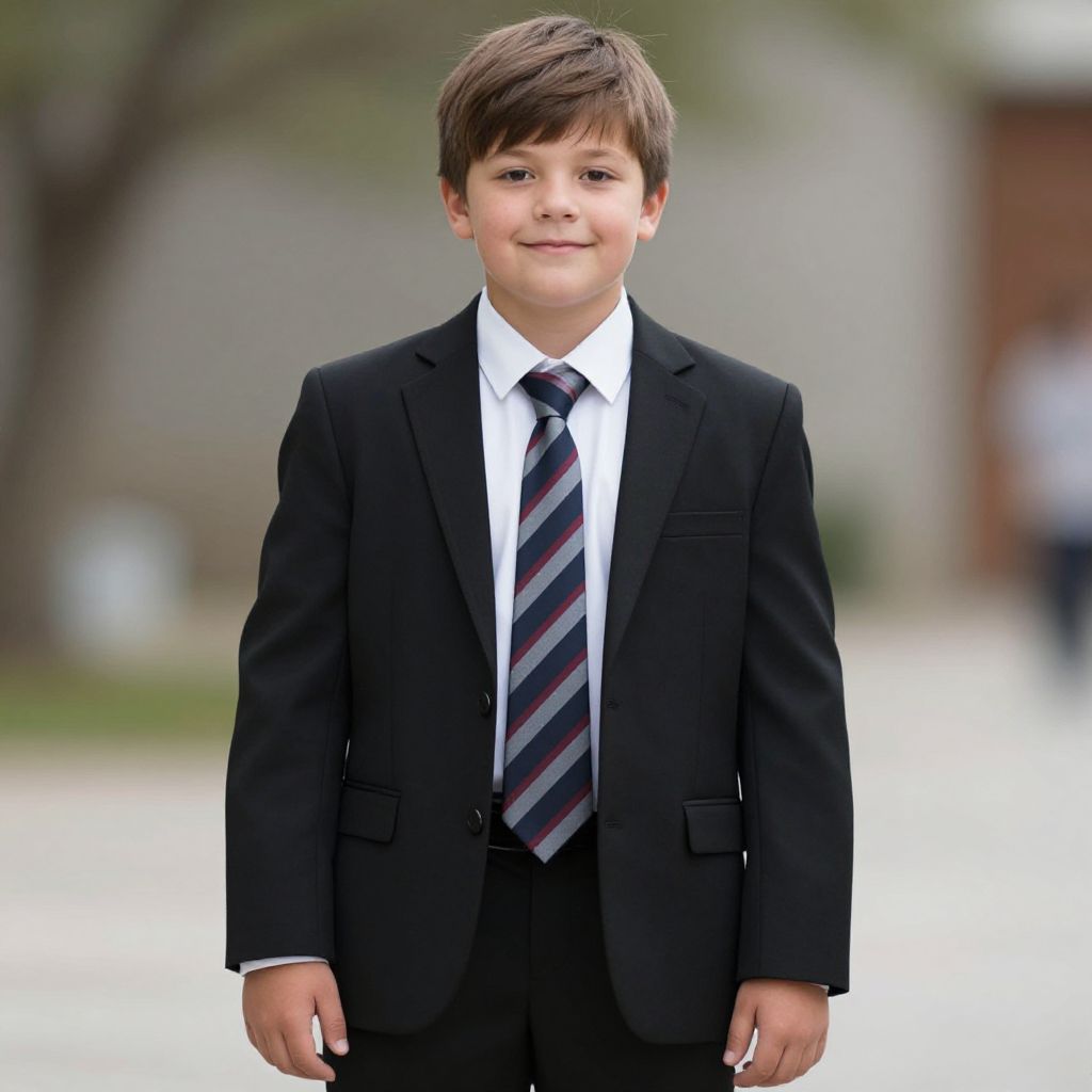 Boy with brown hair, wearing a grey hoodie and blue jeans, standing in front of a red car with a cartoon face on the front. The car has a black backpack on the back, and the boy is smiling.