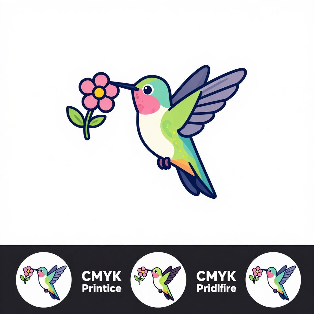 Bright cartoon hummingbird logo design, hovering by a flower sipping nectar, vivid pastel palette; for spring bird migration workshops and backyard wildlife events; clean vector mascot mark, simple shapes, thick outline, high contrast; dynamic, joyful, approachable; circular badge and sticker-ready variants; centered mascot with modern sans serif wordmark placeholder; CMYK print-safe, scalable SVG, smart negative space, balanced layout; light and dark background options; print and merch ready, memorable.