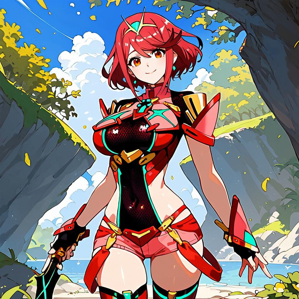 Score_9, score_8, score_7, source_anime, megami magazine, official art, 1girl, pyra \(xenoblade\), xenoblade chronicles 2, xenoblade chronicles \(series\), standing, shiny skin, looking at viewer, smile, outdoors, day, blue sky, cowboy shot, solo