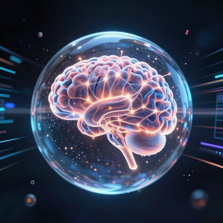 A brain suspended in a shimmering orb of liquid thought floats in zero gravity, rewriting the memories of floating, faceless doppelgängers around it.