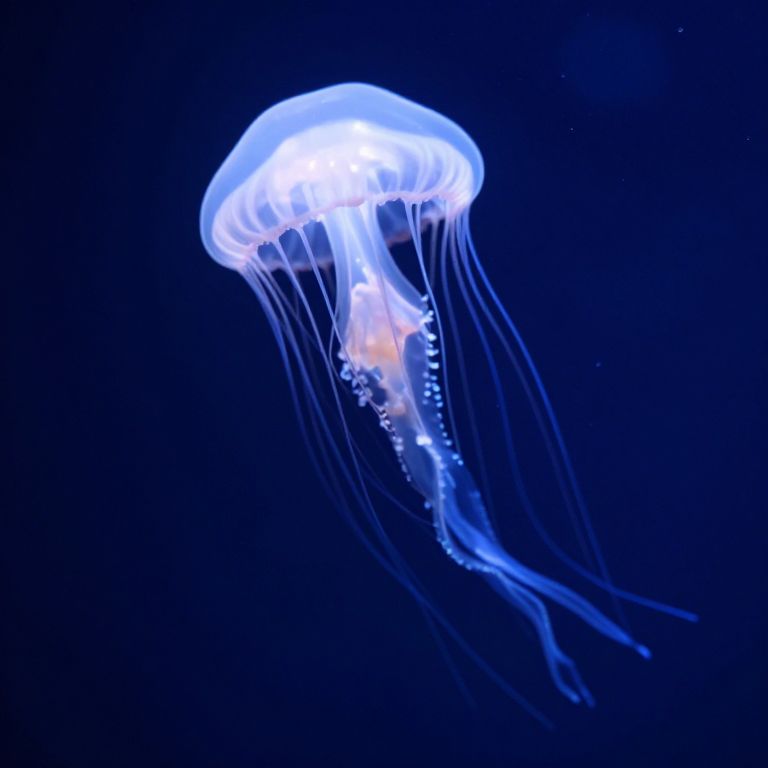 Glowing translucent jellyfish gracefully drifts through a starlit abyss, its bioluminescent body radiating ethereal light while delicate tendrils cascade downward in a mesmerizing dance against the deep blue void.