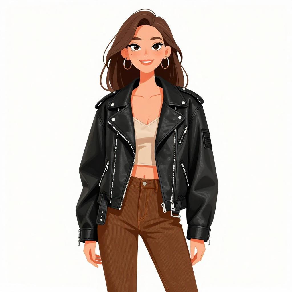 Woman with pretty face and pretty hair. smiling Woman, contemporary street style, black leather biker jacket with notched lapels and zipper details, deep v-neck black top underneath, metallic silver high-waisted trousers with a crinkled texture, elastic waistband, cropped length, paired with black ankle boots with a moderate heel, natural makeup and tousled medium-length hairstyle, posed against a neutral seamless backdrop. --sref 1467
