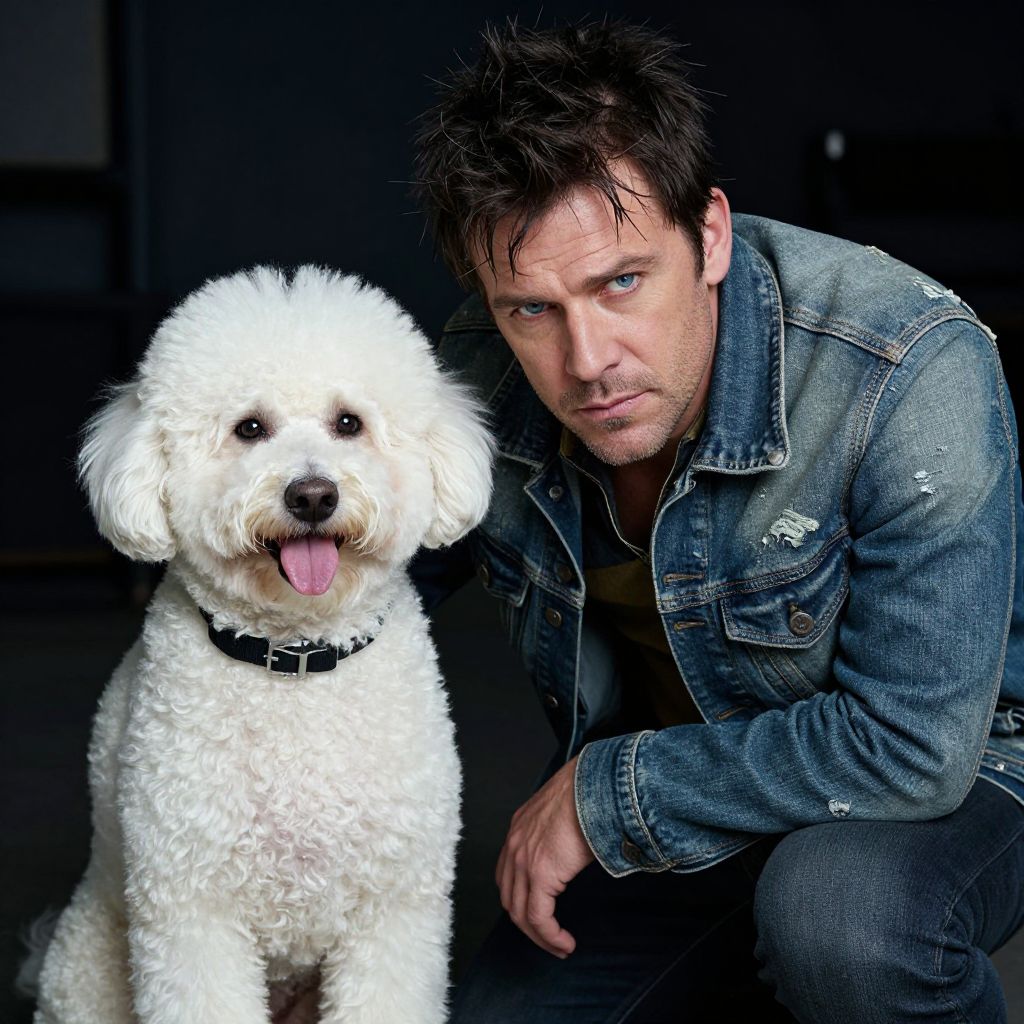 Photograph of a rugged-looking man with messy dark hair and intense blue eyes, wearing a worn denim jacket. He's kneeling next to a fluffy, white poodle with a black collar and a pink tongue hanging out. The background is dark and blurred, making the man and dog the main focus. The man's expression is serious, while the dog looks happy and relaxed.