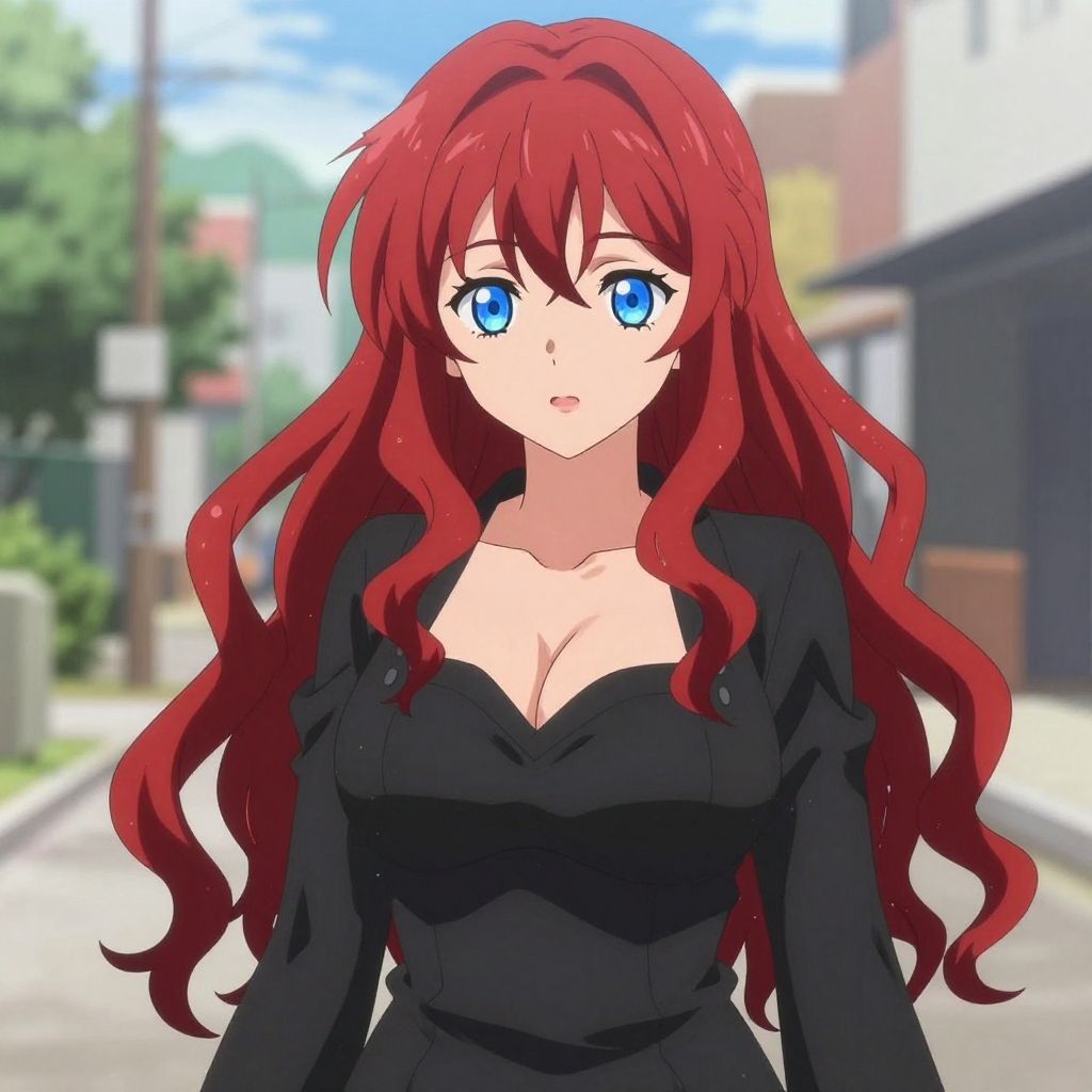 Masterpiece, best quality, 1girl, long hair, looking at viewer, :3, cute, black school uniform, outdoors, streets, cowboy shot, large breasts, curvy, (((blue eyes))), rias gremory, red hair, antenna hair, wavy hair, ((beautiful detailed eyes, beautiful detailed glow, lots of glow)), anime screencap