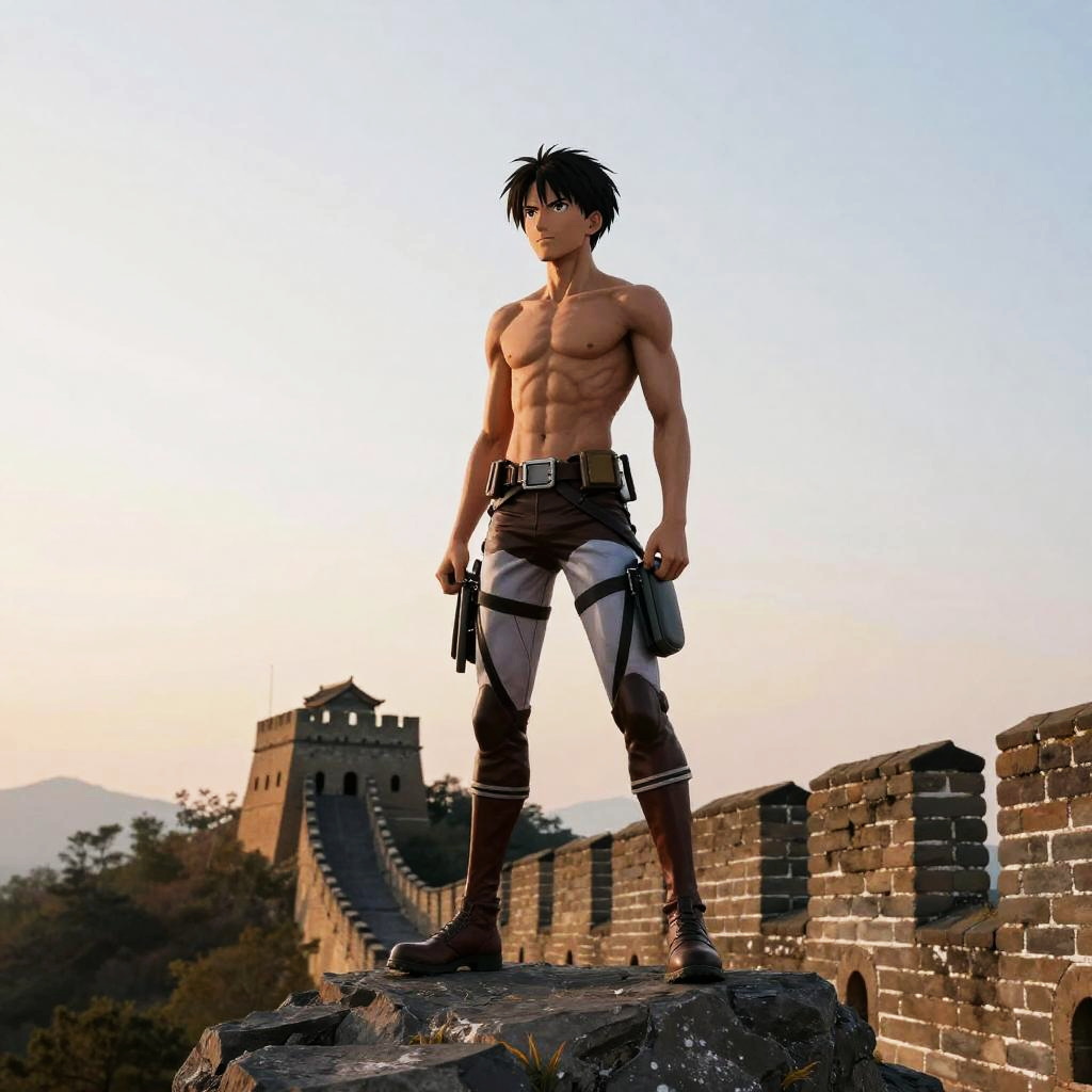 Chinese Eren Yeager standing atop the Great Wall of China at dawn, ready to fight Titans, blending realism with anime flair, focus on atmospheric perspective and epic scale