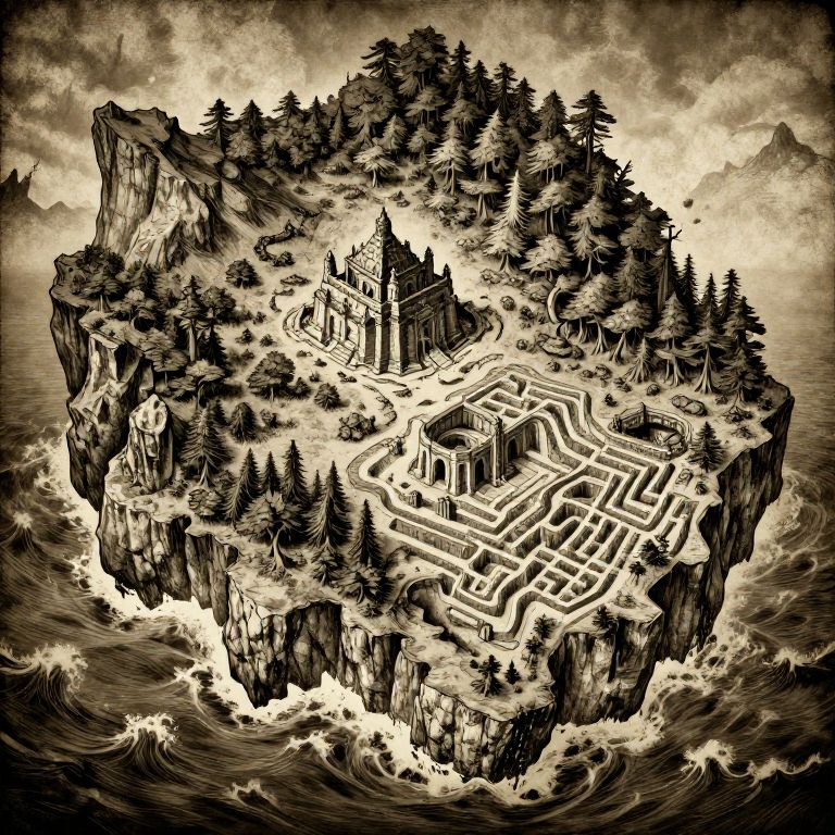 This is a digital ink drawing in a black-and-white, sepia-toned style, depicting a floating island surrounded by turbulent waves. The island is densely forested with tall, dark pine trees. At the center, there is a gothic-style castle with a tall spire. Surrounding the castle are intricate, maze-like pathways winding through the forest. The island's rocky cliffs are visible on the left side, while the right side shows a dramatic drop into the stormy sea below. The sky above is cloudy with a sense of impending storm, adding to the mysterious and eerie atmosphere.